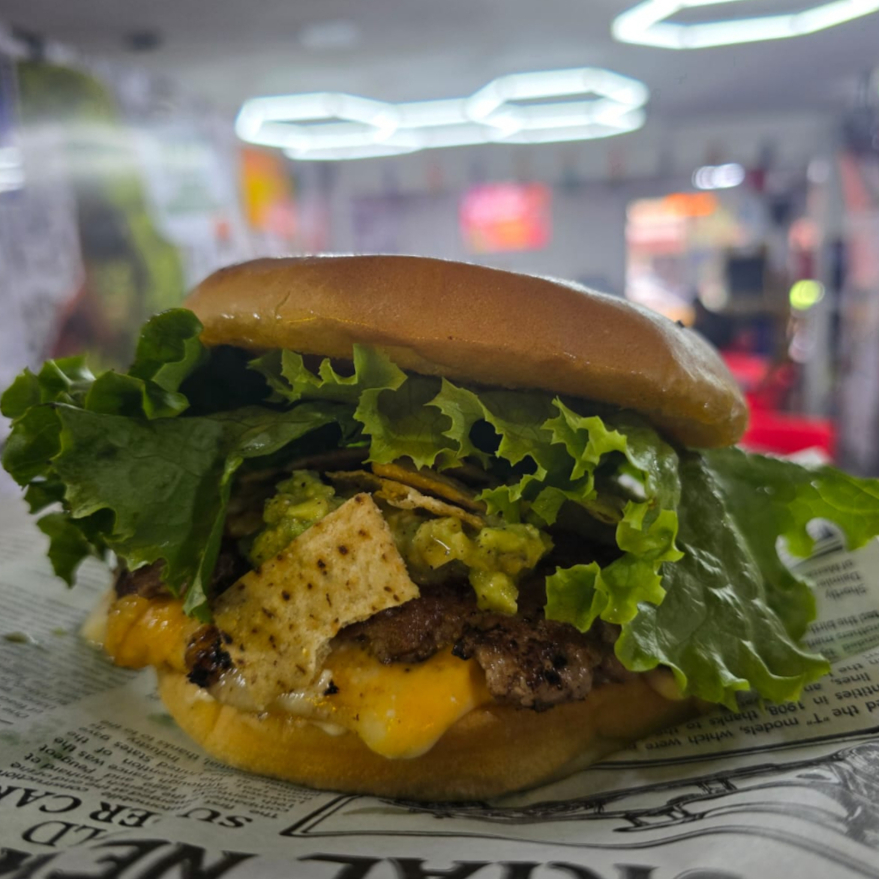 Top Sirloin (200g), doble costra de queso, doble queso cheddar, aguacate y totopos