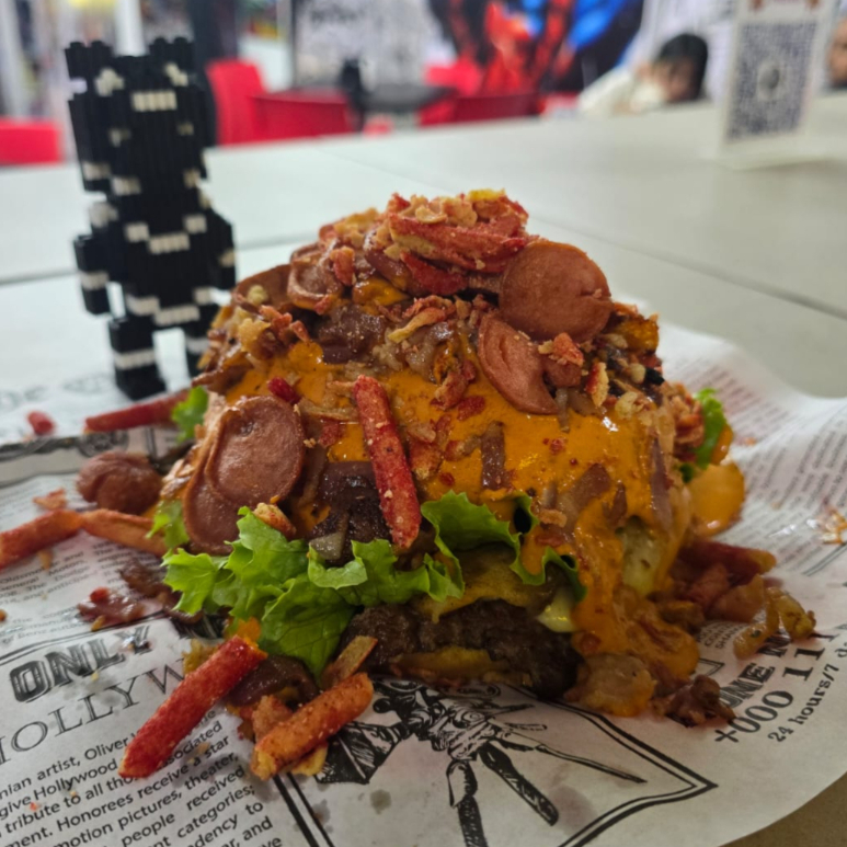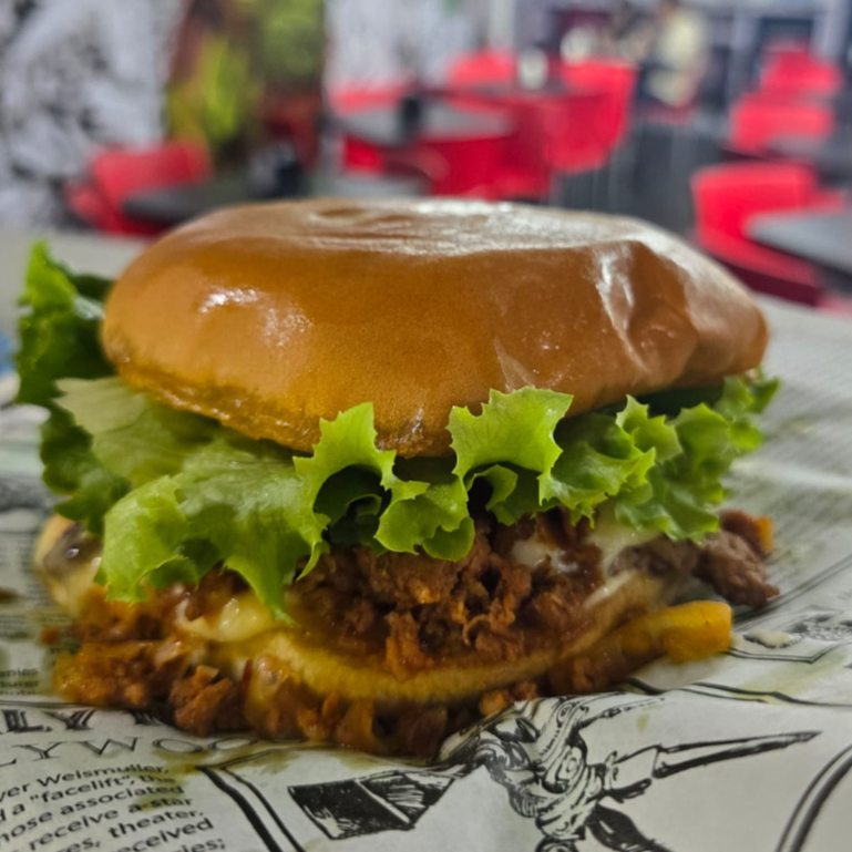 Top Sirloin (100g), costra de queso, queso cheddar, acompañado de salsa de chipotle con tocino crispy y Takis (para bañar la burger).