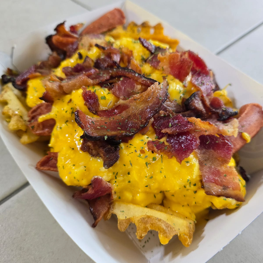 Papas Waffle, bañadas en salsa de queso cheddar, salchicha y tocino crispy.