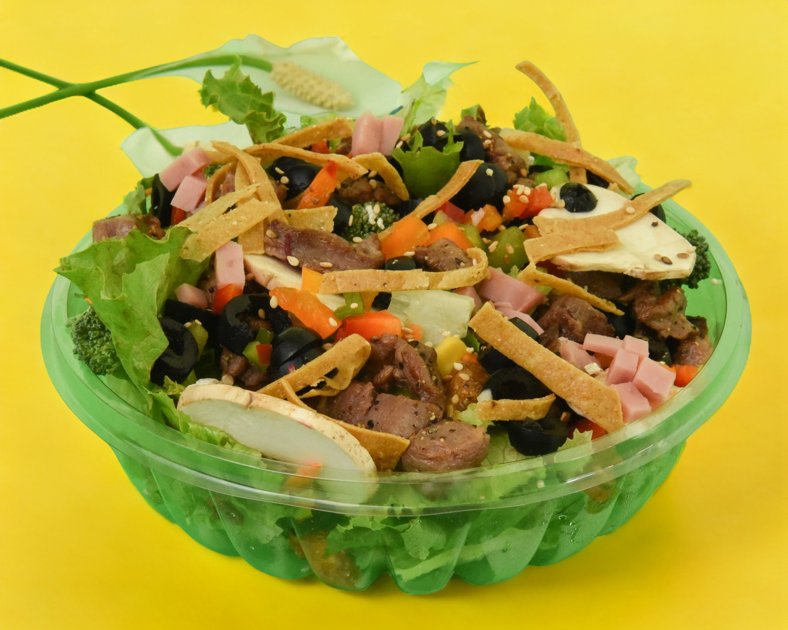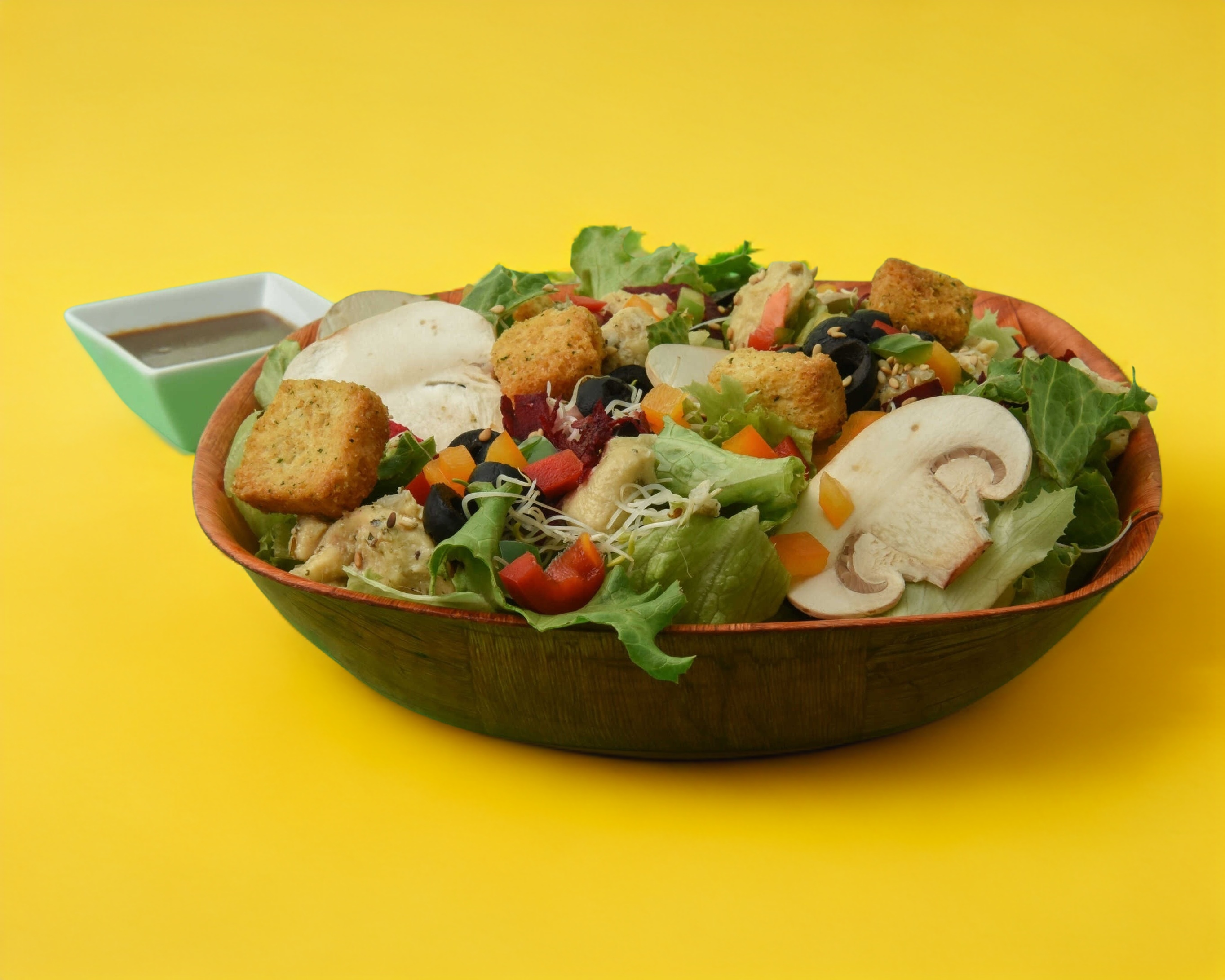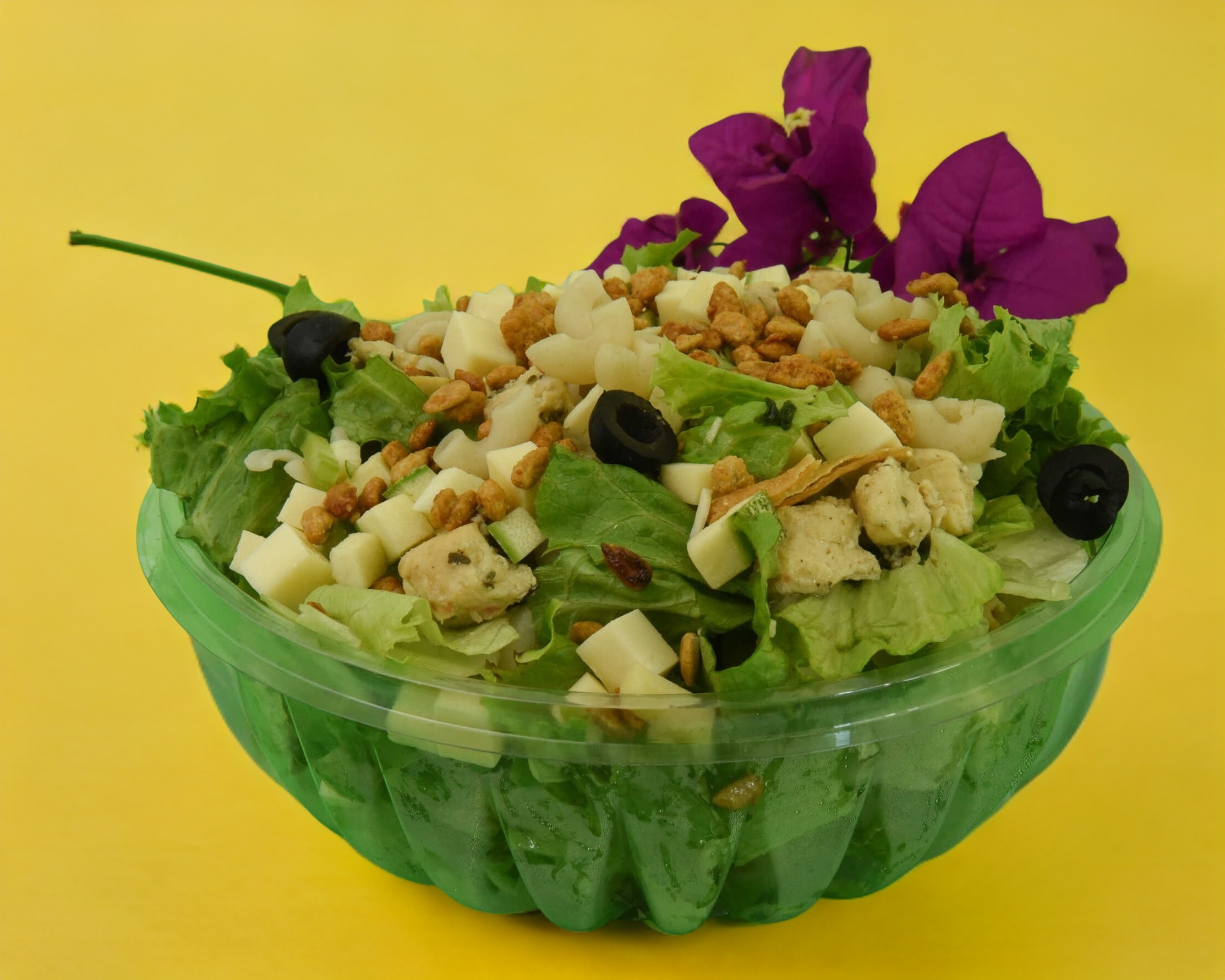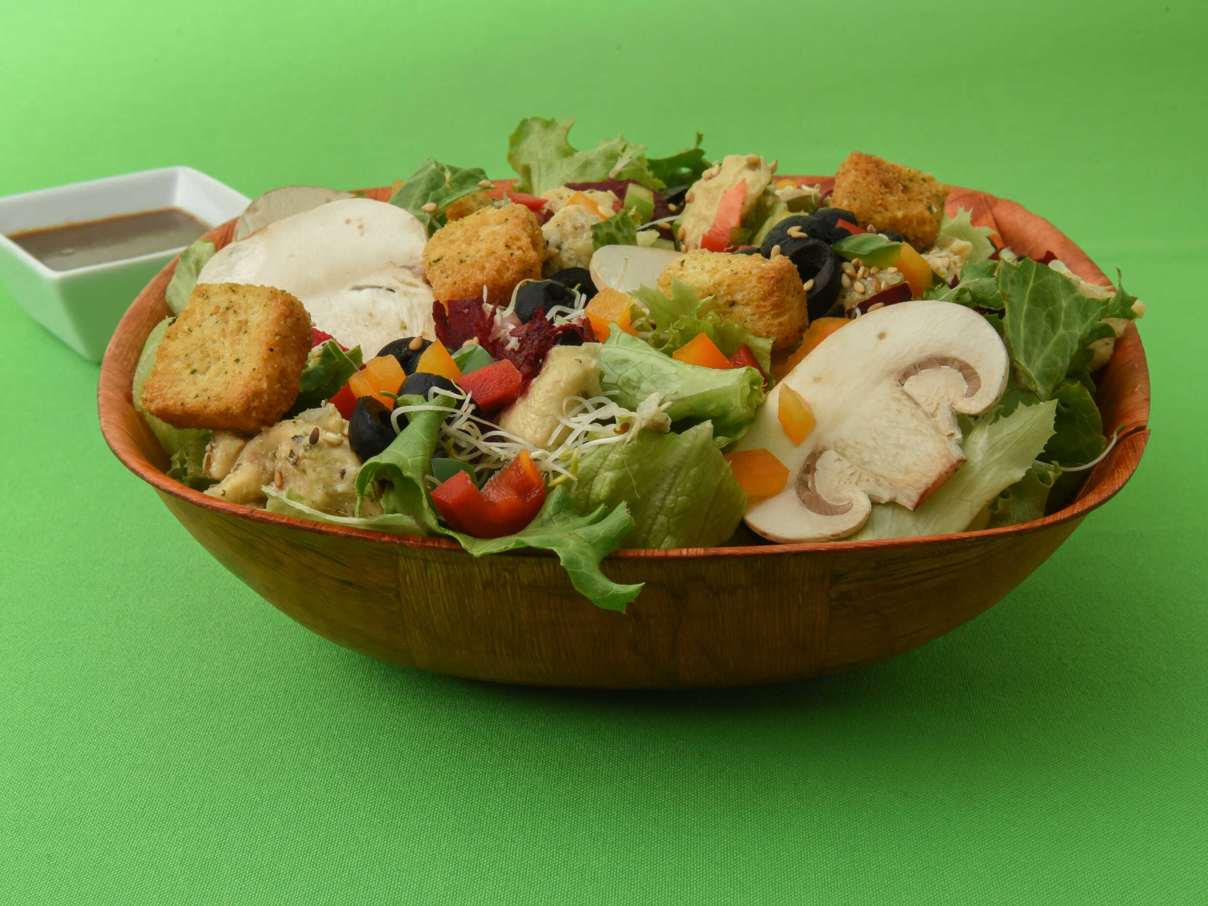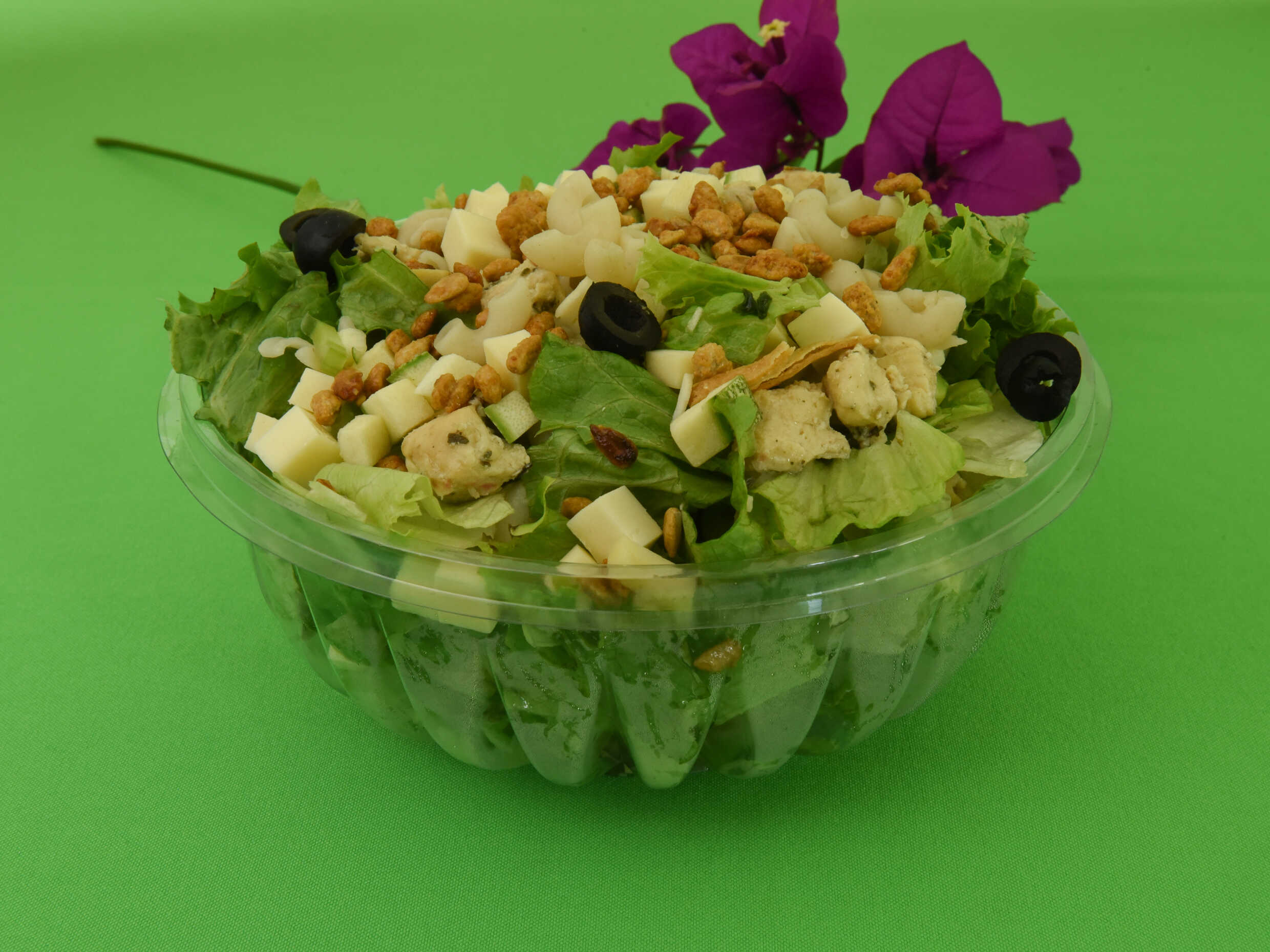 Ensalada fresca de tamaño mediano con aderezo a elección, acompañada de tortilla o crotones. Incluye aprox. 120 g de pollo, con la preparación de tu preferencia.
