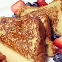 Pan de Caja bañado en una mezcla especial de la casa acompañado de fruta y maple.