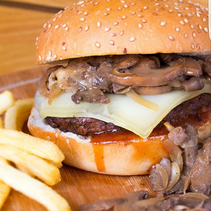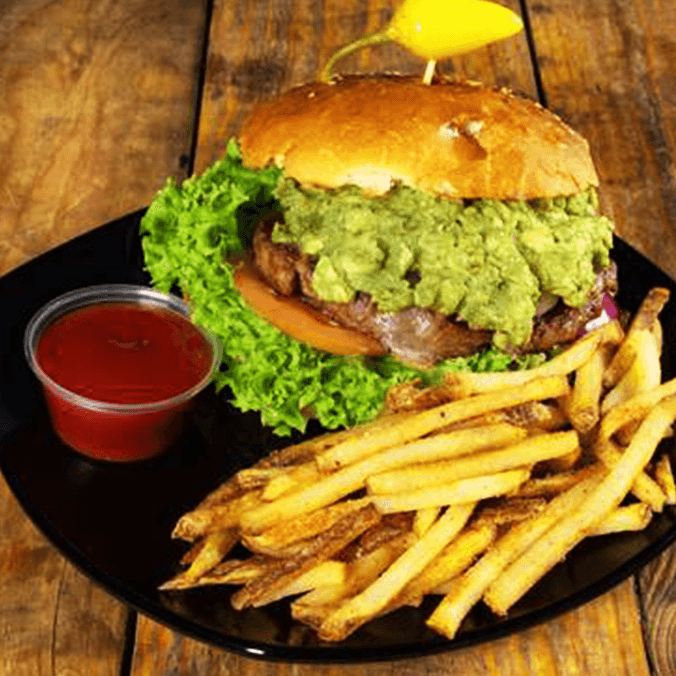 Pan, mayonesa, mostaza, catsup, lechuga, cebolla caramelizada, pepinillos, carne de la casa, queso manchego, champiñones, aguacate y acompañado de 150gr de papas a la francesas