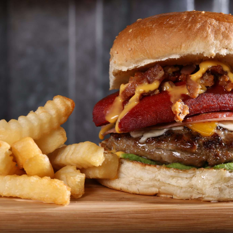 Pan, mayonesa, mostaza, catsup, lechuga, cebolla caramelizada con habanero, pepinillos, carne de la casa, queso manchego, tocino, salchicha y acompañado de 150gr de papas a la francesa
