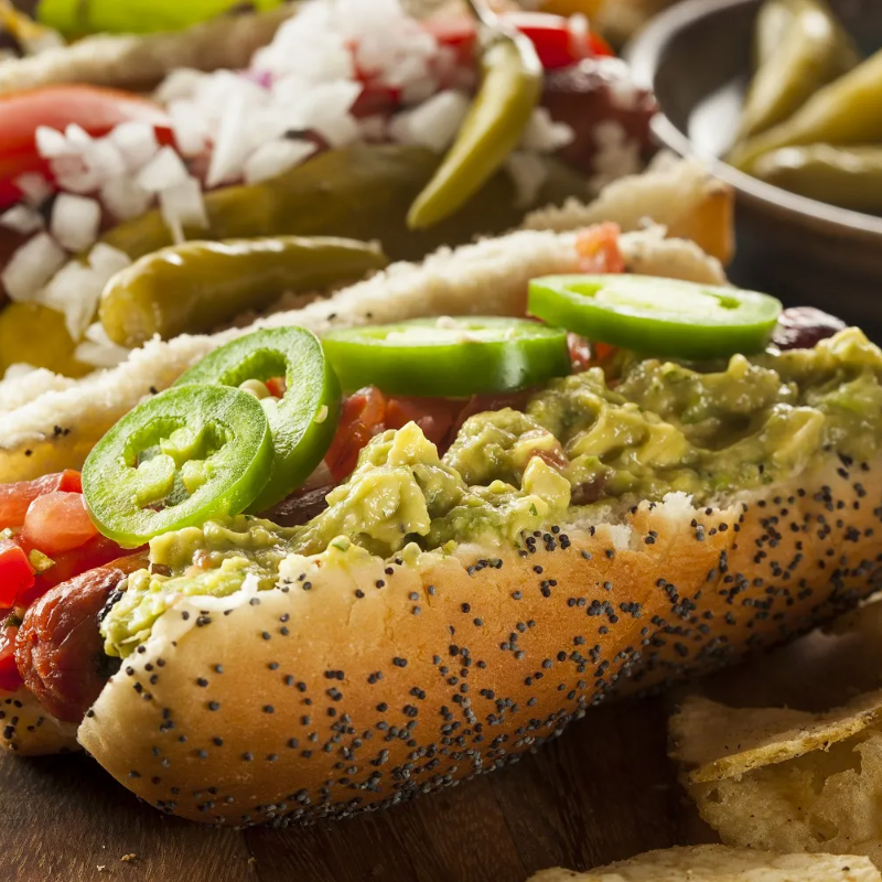 Pan medias noches de (60.7g), salchicha, tocino, guacamole, mayonesa, cebolla caramelizada con habanero y mostaza.