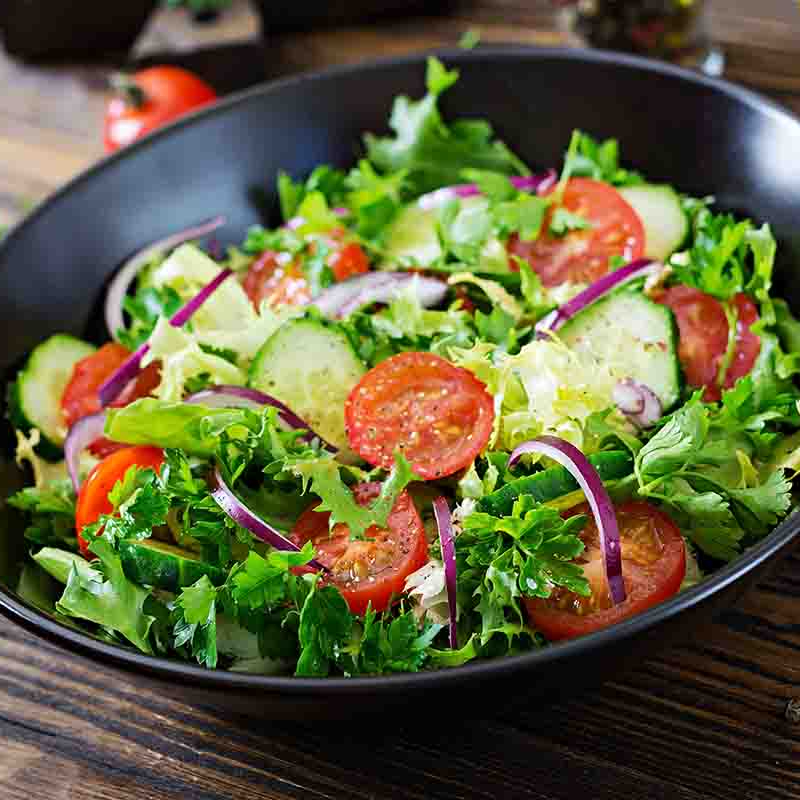 Mix de lchugas, peino, pimiento, cebolla morada, crotones, aceitunas, boneless, aderezo