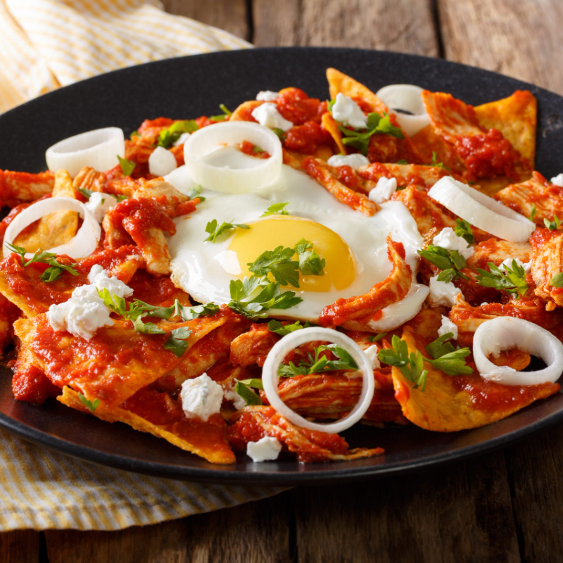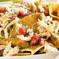 Totopos bañados en salsa de su preferencia (Rojos o Verdes), acompañado de frijol, queso y crema)