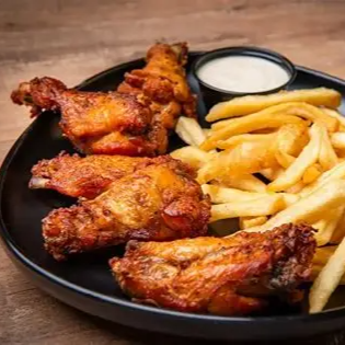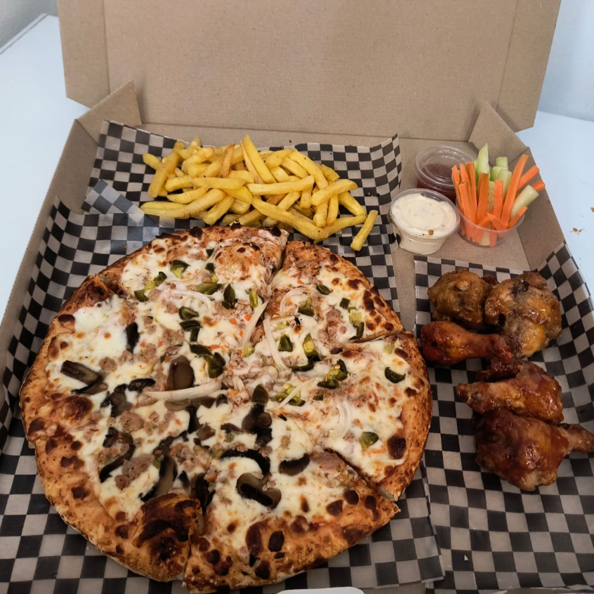 Pizza mediana (sabor a elegir) acompañado de 250gr de alitas y 250 gr de papas a la francesa