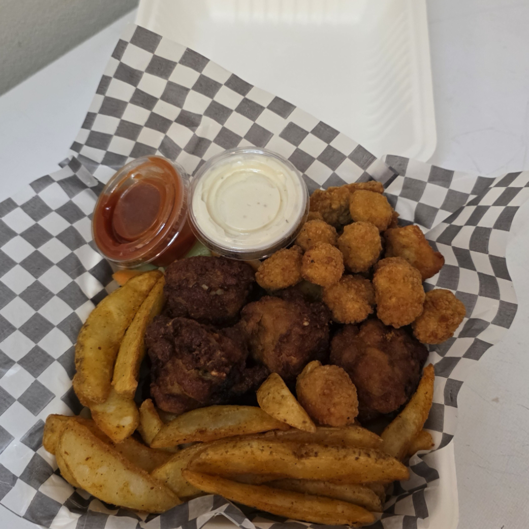 4 alitas, 10 palomitas, 4 boneless, 2k-Tiras y Papas gajos