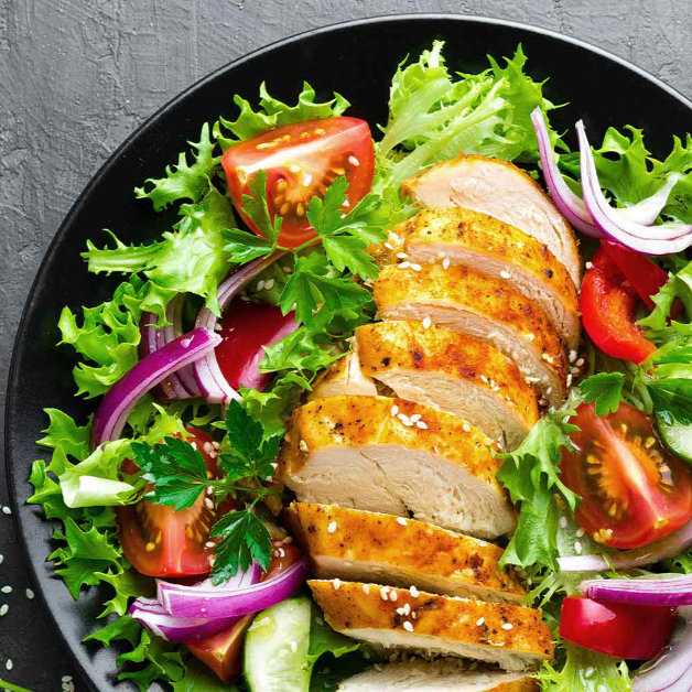 Mix de lechugas, pepino, jitomate, pechuga de pollo, queso parmesano y aderezo mil islas