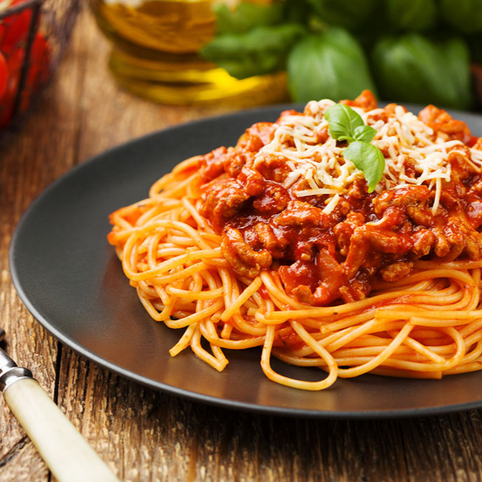 Salsa de tomate, carne molida, champiñones, zanahoria, apio, cebolla y queso parmesano