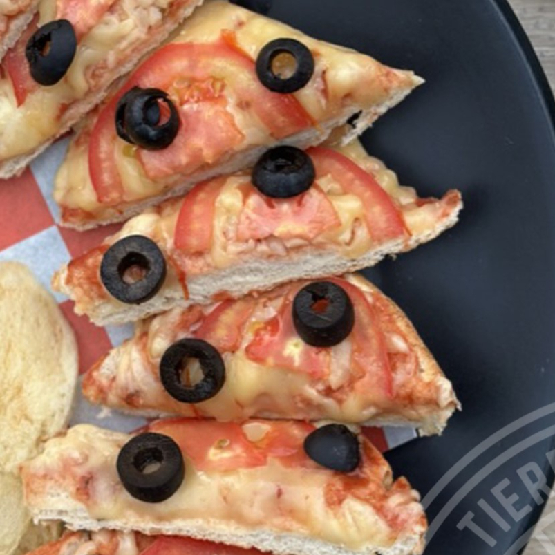 Chapata con salsa tipo pomodoro cubierta con queso manchego gratinado, aceitunas negras y jitomate.