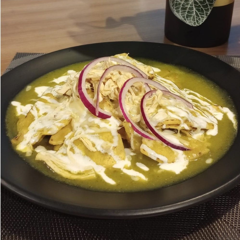 Totopos crujientes, bañados en salsa verde, con queso y crema, llenos de sabor tradicional.
