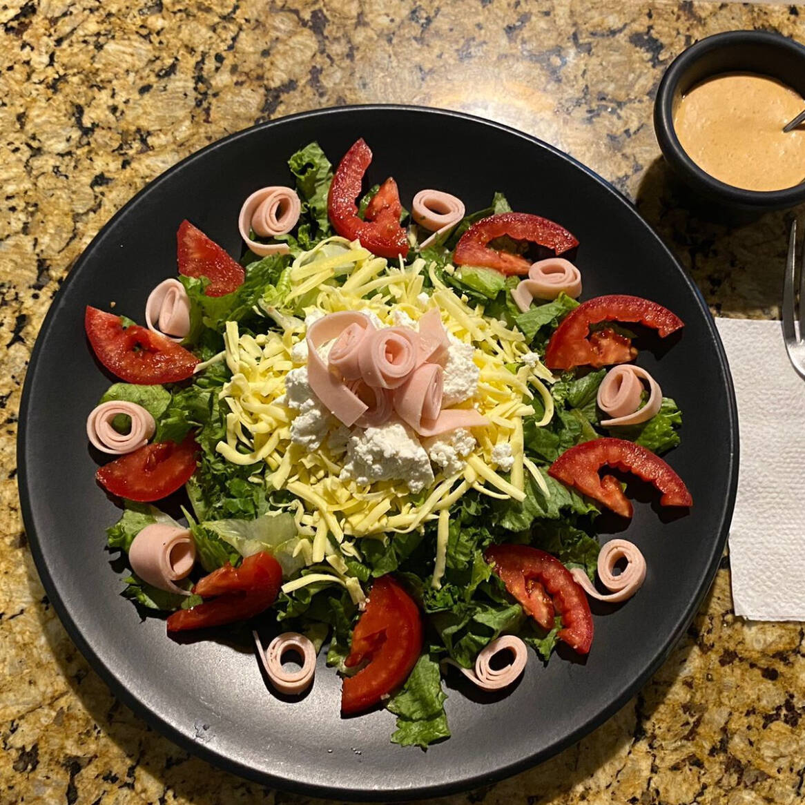 Lechuga, jitomate, jamón de pavo, queso manchego, queso de cabra y aderezo Ranch.