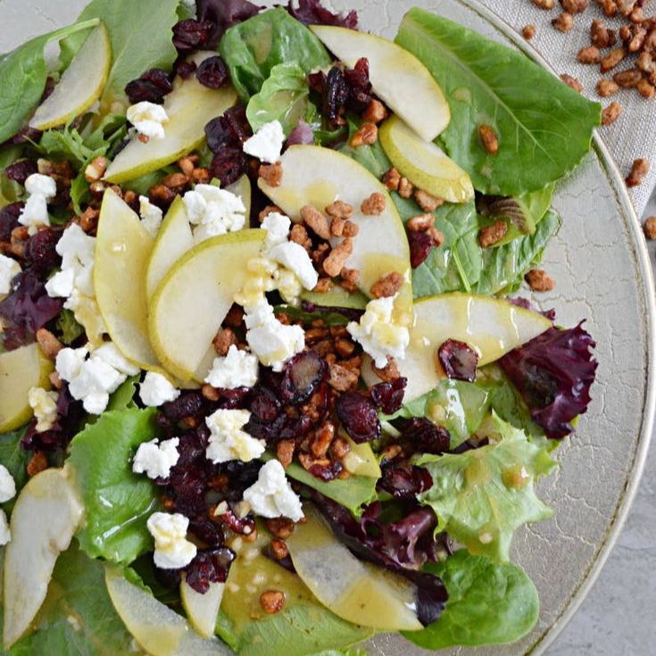 Lechuga, arándanos, nuez, queso de cabra, pera y aderezo de mostaza con miel.