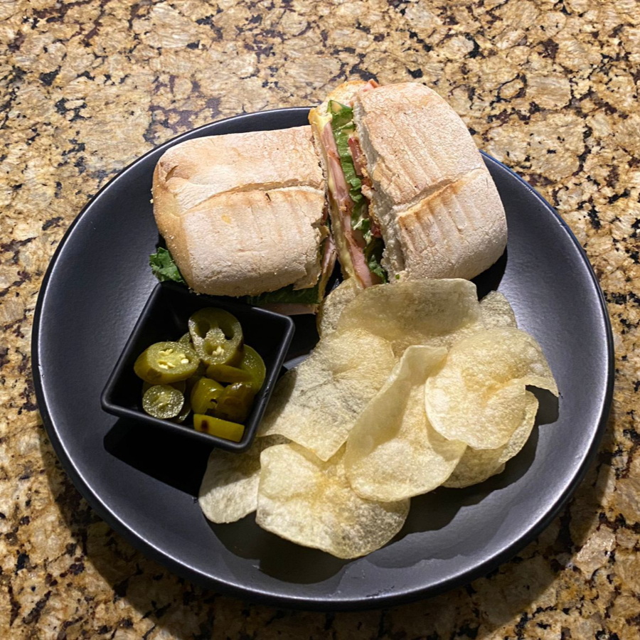 Pan chapata dorado, con jamón de pavo, queso gratinado, vegetales frescos y aderezo de chipotle.