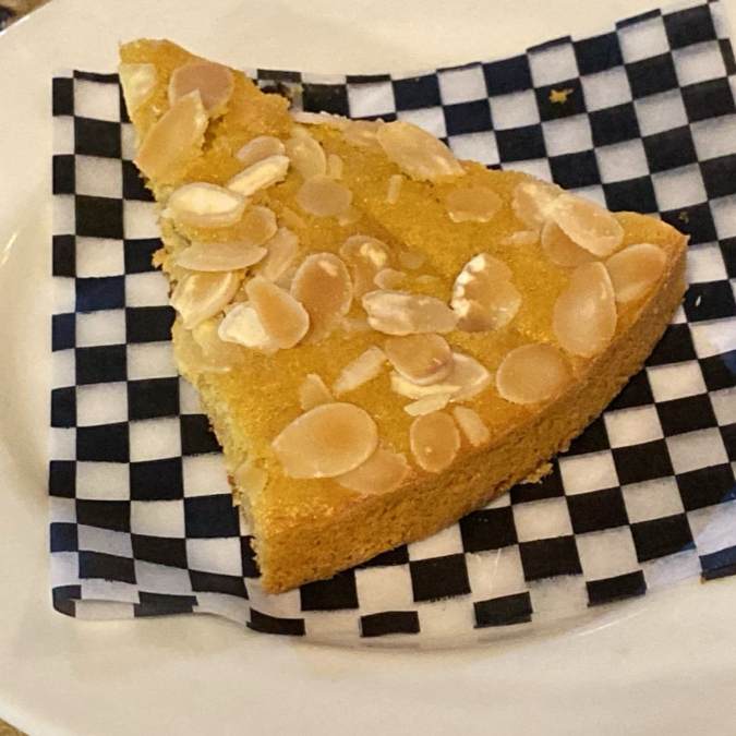 Tarta suave tipo panqué con almendras horneadas.