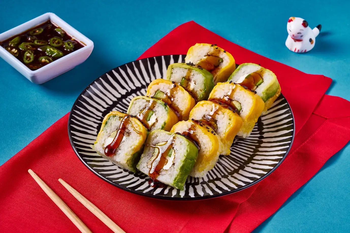 Rollo con pollo en tempura, queso manchego y salsa teriyaki.