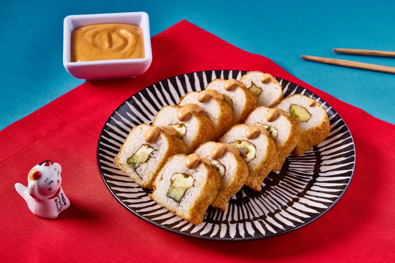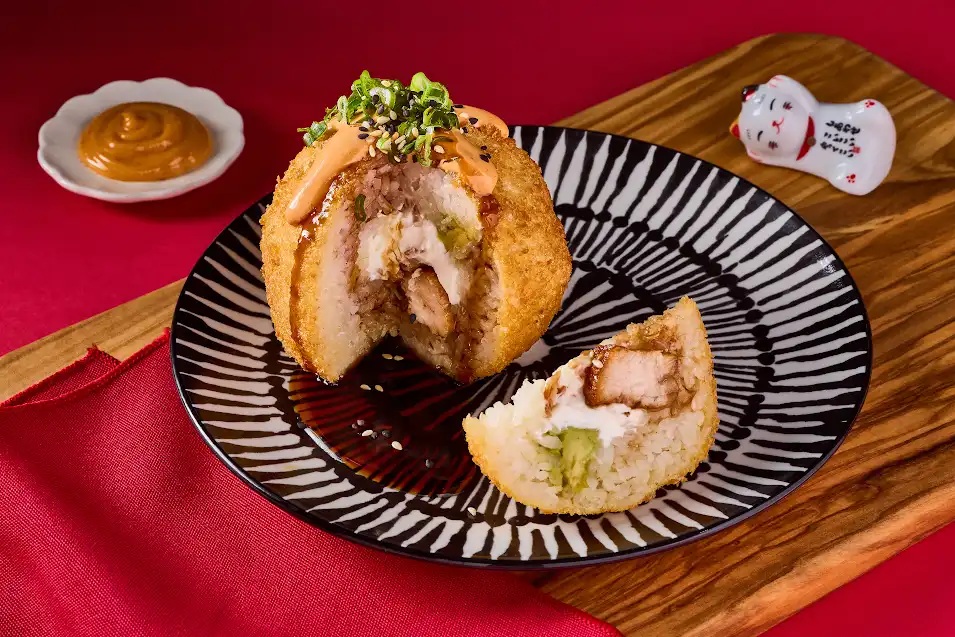 Esfera de arroz empanizada, rellena de pollo teriyaki, queso crema y aguacate, con salsa teriyaki, chipotle, ajonjolí y cebollín.