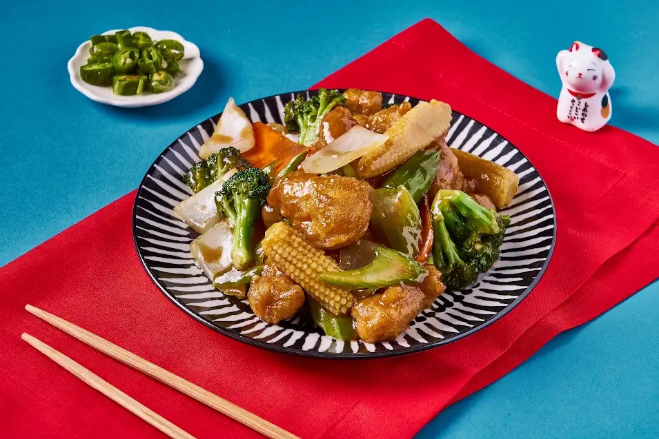 Tiras de pechuga de pollo rebosadas y fritas, salteadas con verduras frescas y salsa de ostión.