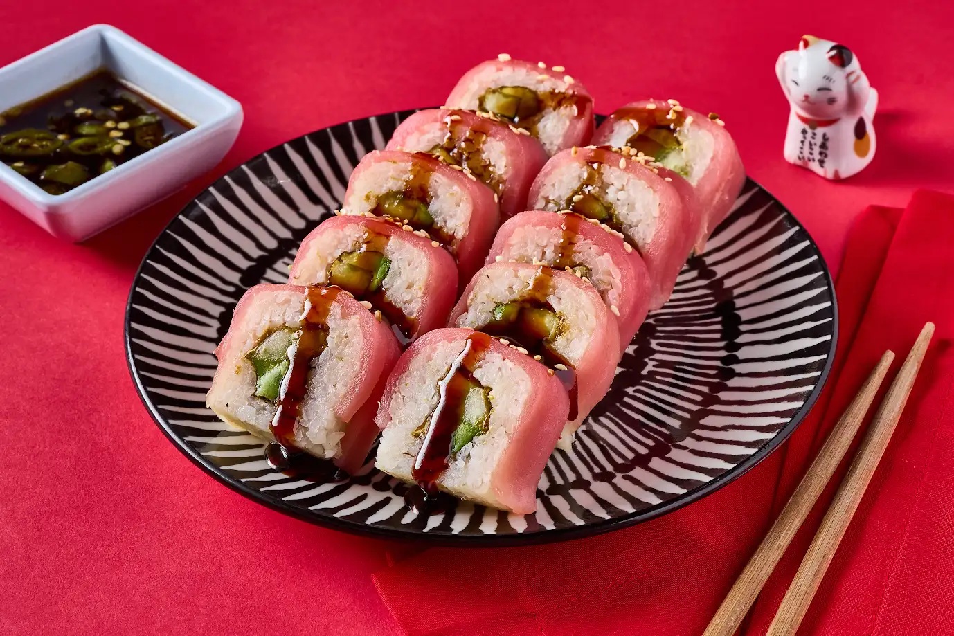 Rollo con topping de atún fresco, relleno de pepino, aguacate y queso crema, con salsa BBQ y ajonjolí.