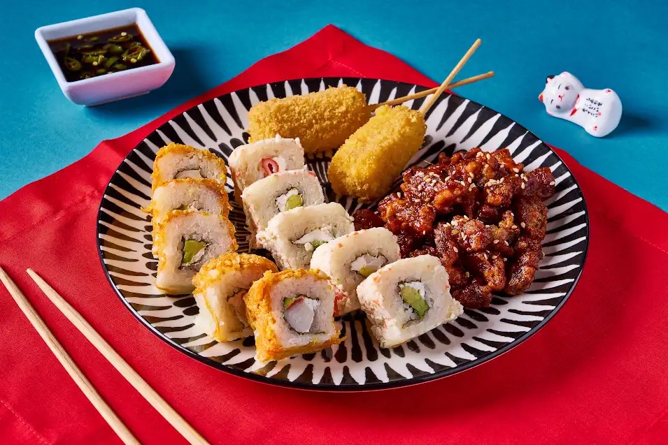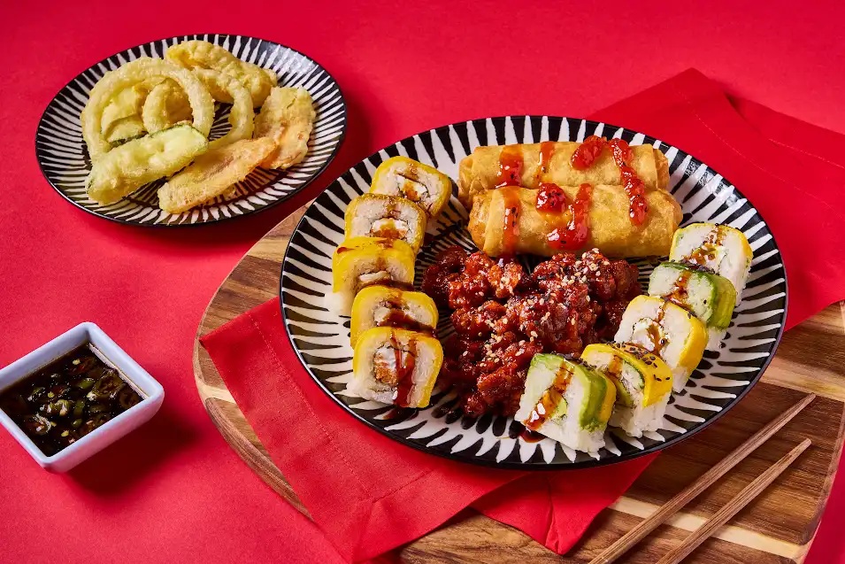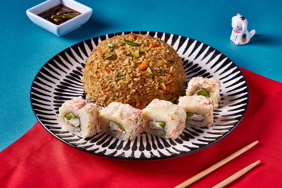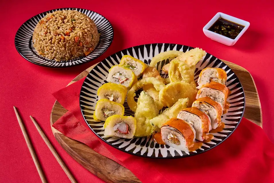 Arma tu combo con un rollo favorito y yakimeshi o noodles. Algunos favoritos tienen costo extra.