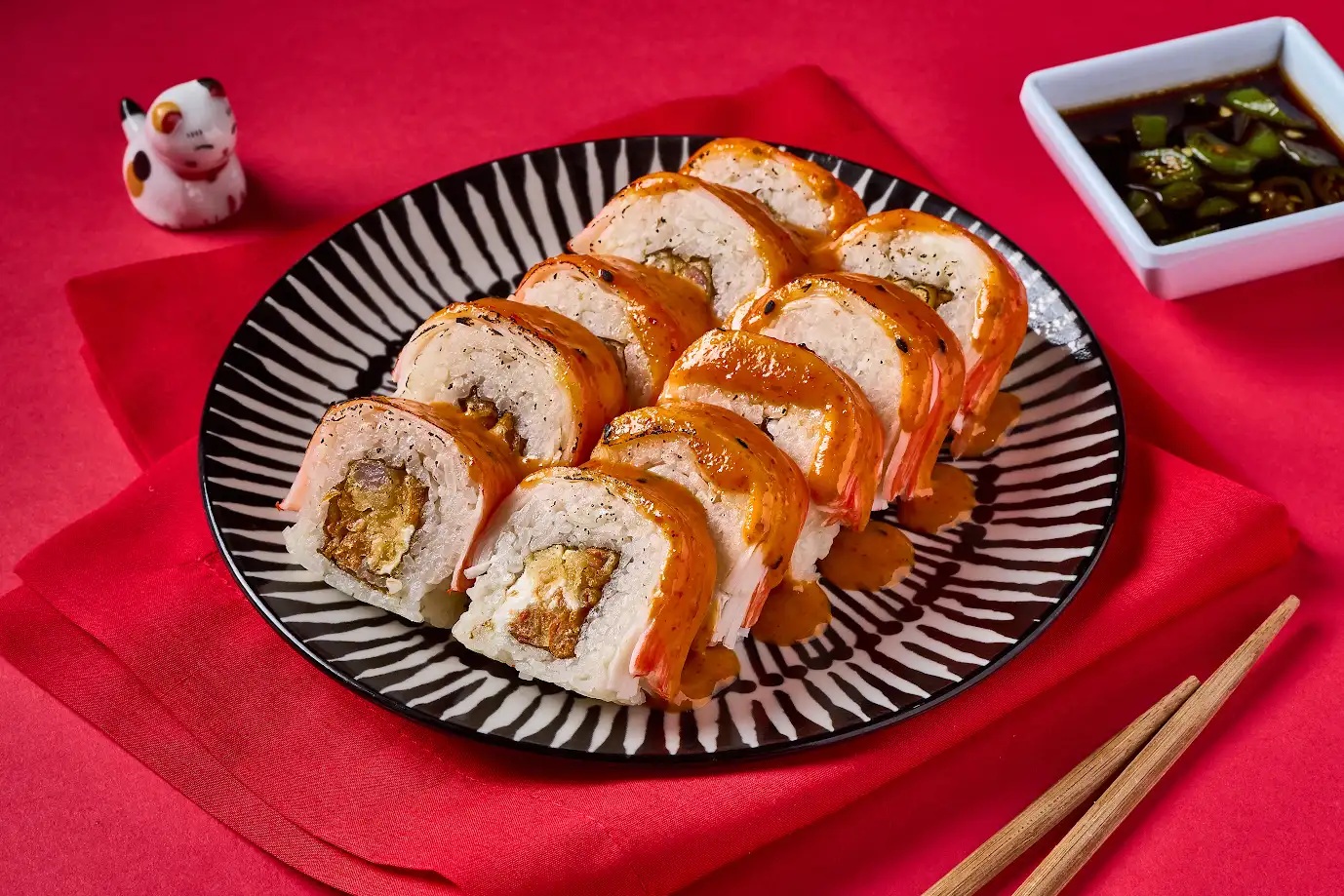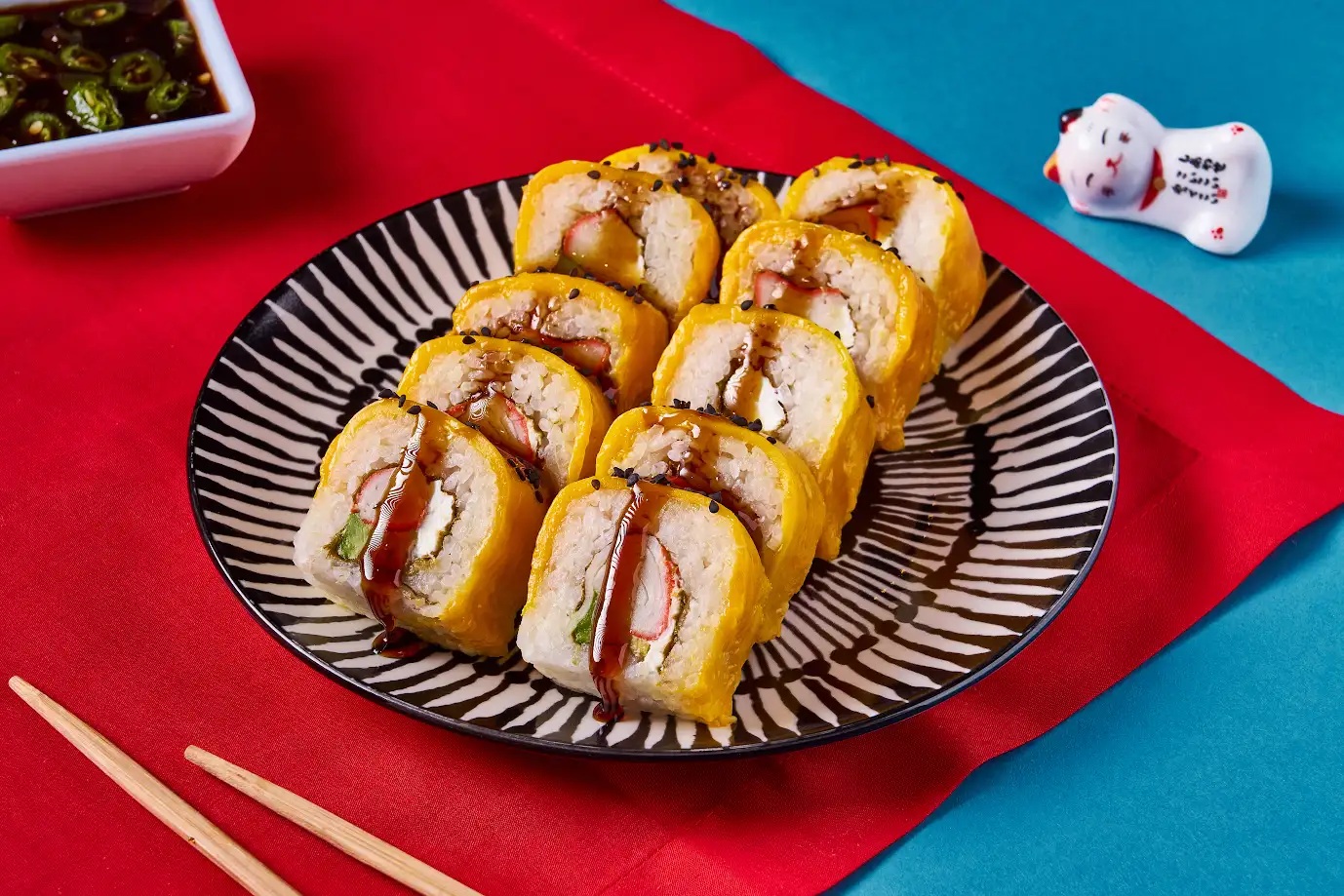 Rollo con pollo en tempura, queso manchego y salsa teriyaki.