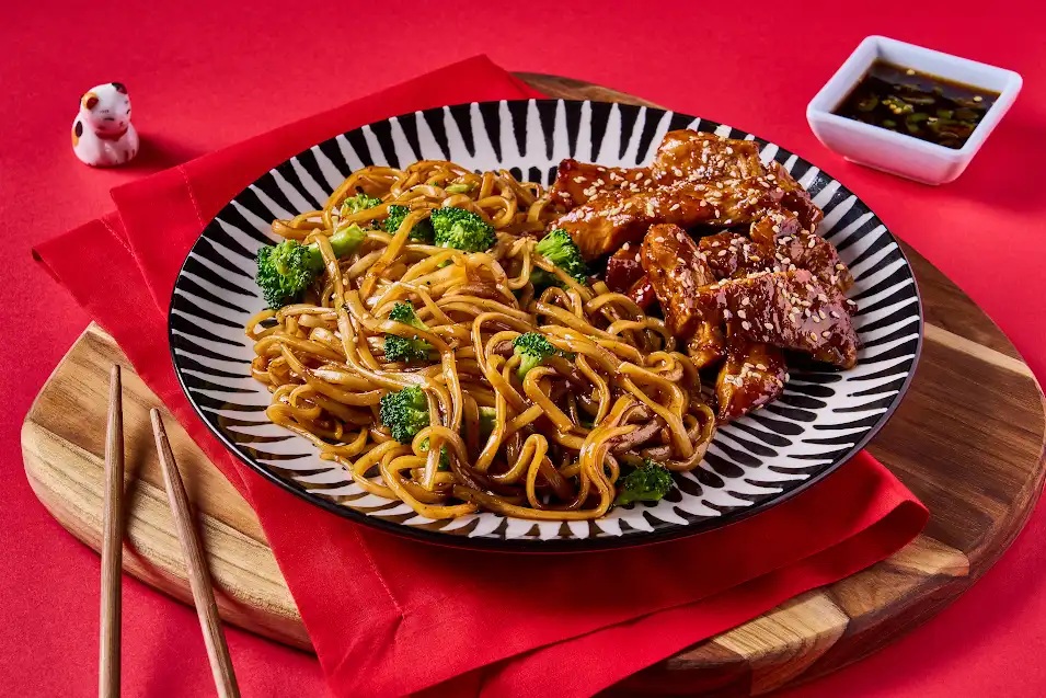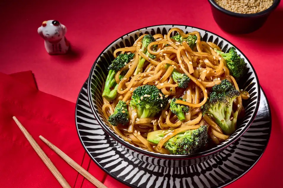 Fideos udon salteados con brócoli y bañados en salsa teriyaki.