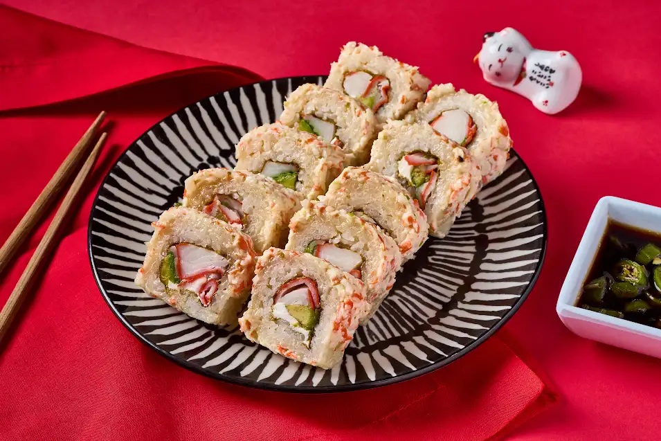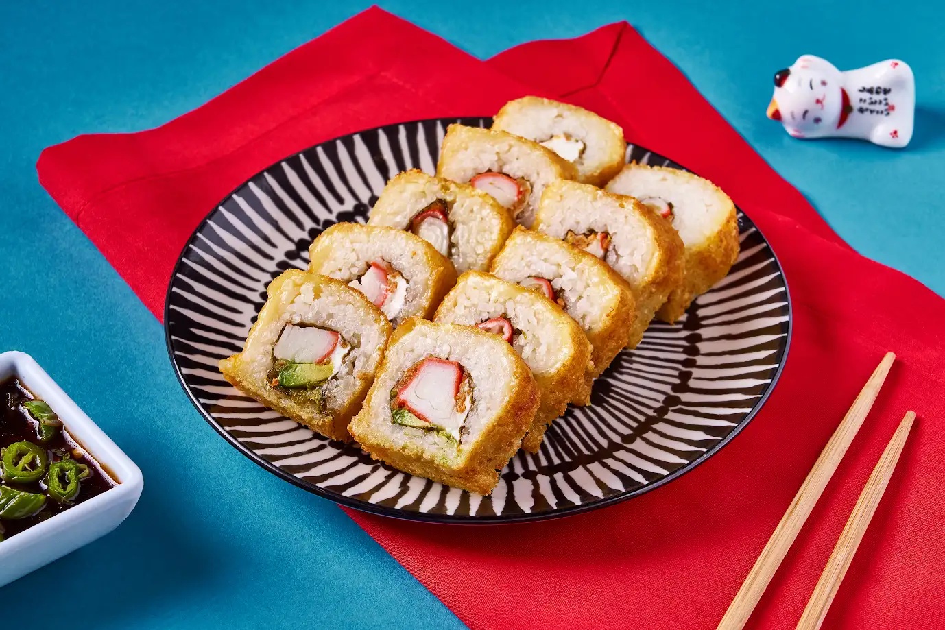 Rollo empanizado con queso manchego, relleno de cangrejo, aguacate, queso crema y chiles.
