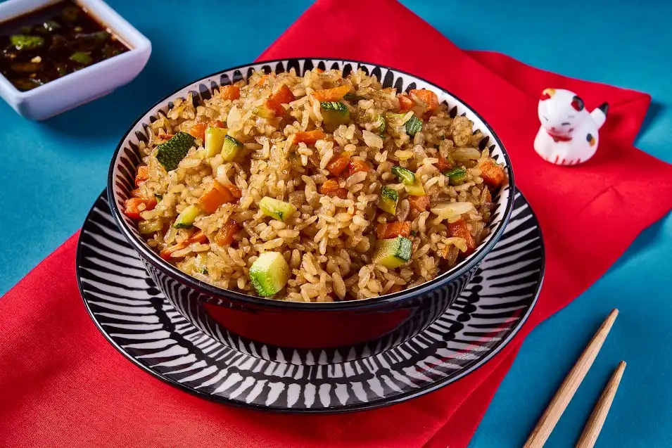 Arroz japonés salteado con zanahoria, cebolla y calabacita, sazonado con mantequilla y salsa de soya.