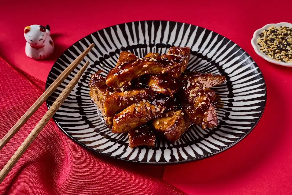 Pechuga de pollo asada al grill, glaseada con salsa teriyaki y ajonjolí.