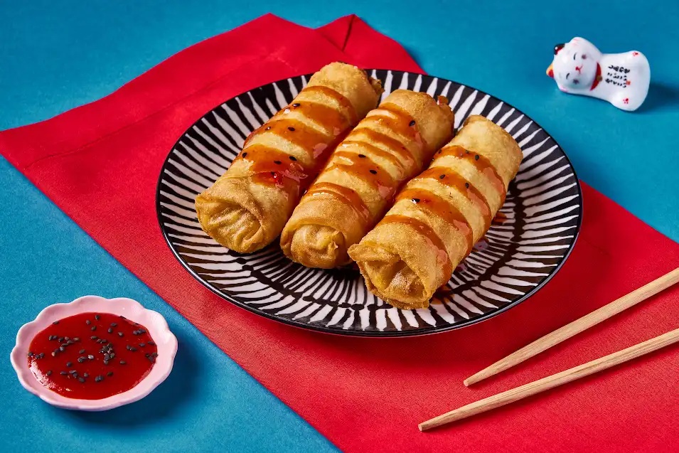 Rollitos de won ton rellenos de pollo, tocino, macarrón y mezcla de quesos, servidos con salsa agridulce.