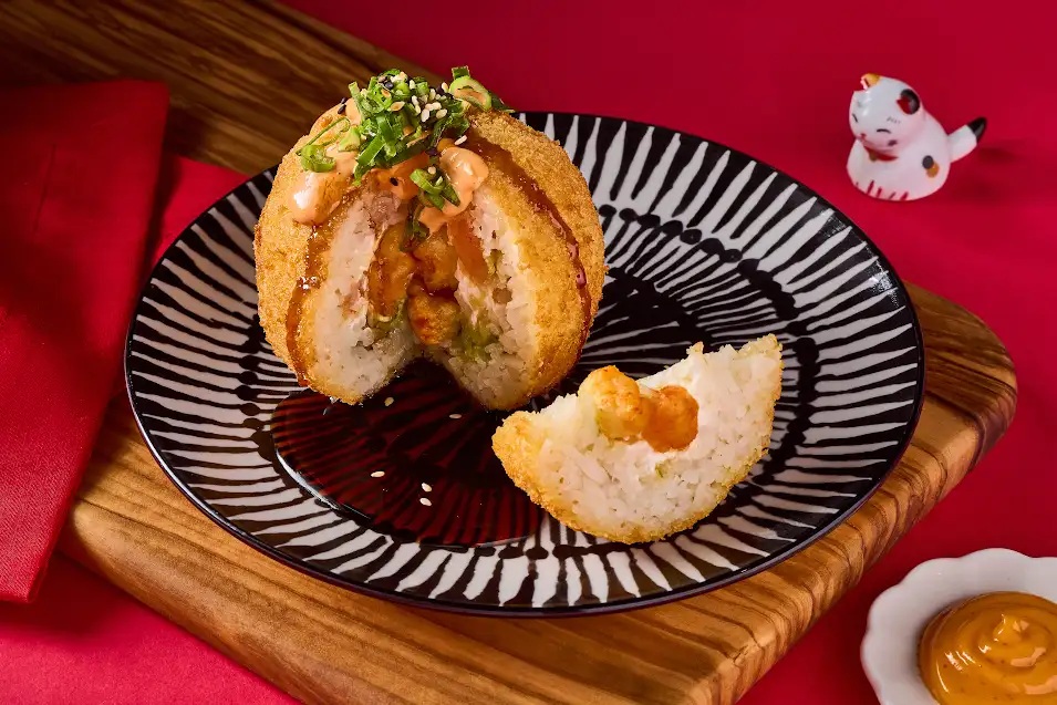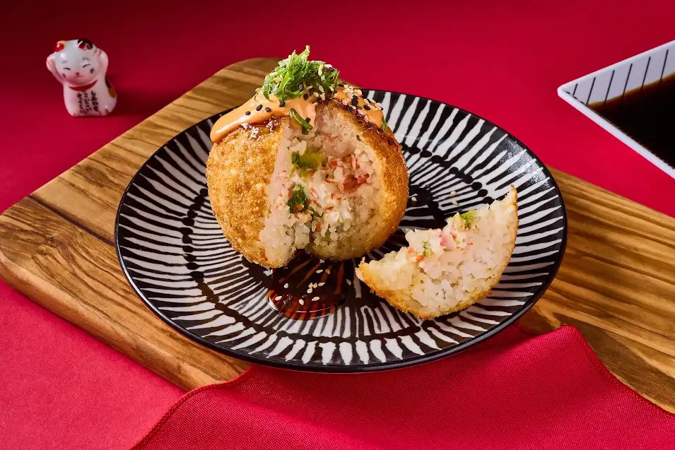 Esfera de arroz empanizada, rellena de tampico, queso crema y aguacate, con salsa teriyaki, chipotle, ajonjolí y cebollín.