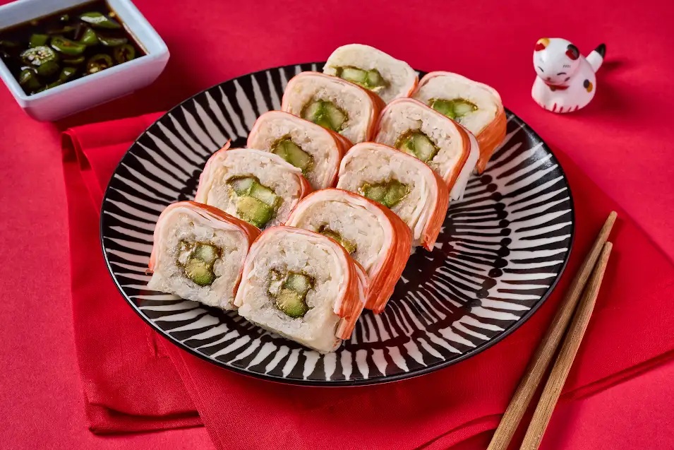 Rollo envuelto en mango, con cangrejo, queso crema, aguacate, salsa BBQ y ajonjolí.