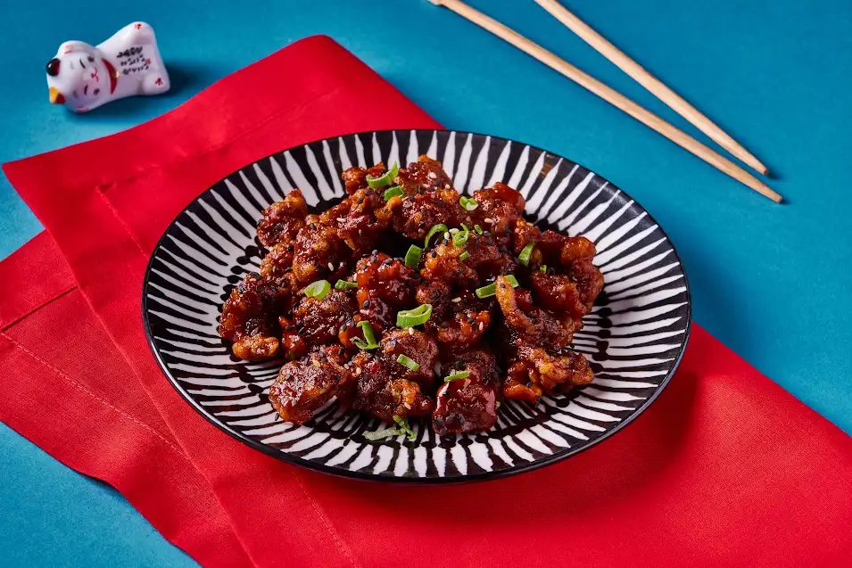 Trozos de pierna y muslo de pollo empanizados, bañados en salsa picante estilo house.
