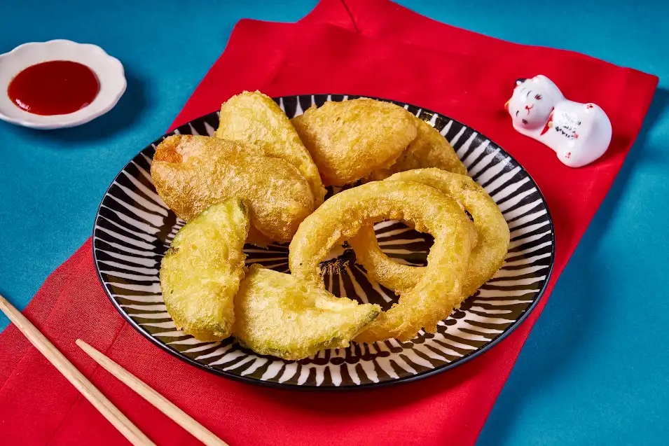Láminas de calabaza, cebolla, zanahoria y plátano macho en tempura crujiente.