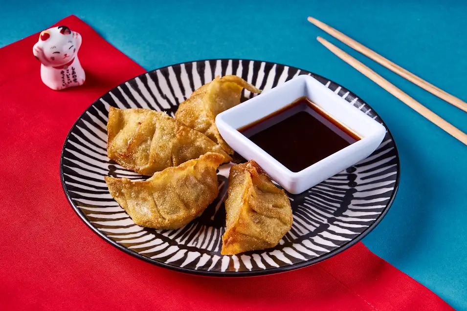 Dumplings fritos rellenos de cerdo y verduras, servidos con salsa agridulce.