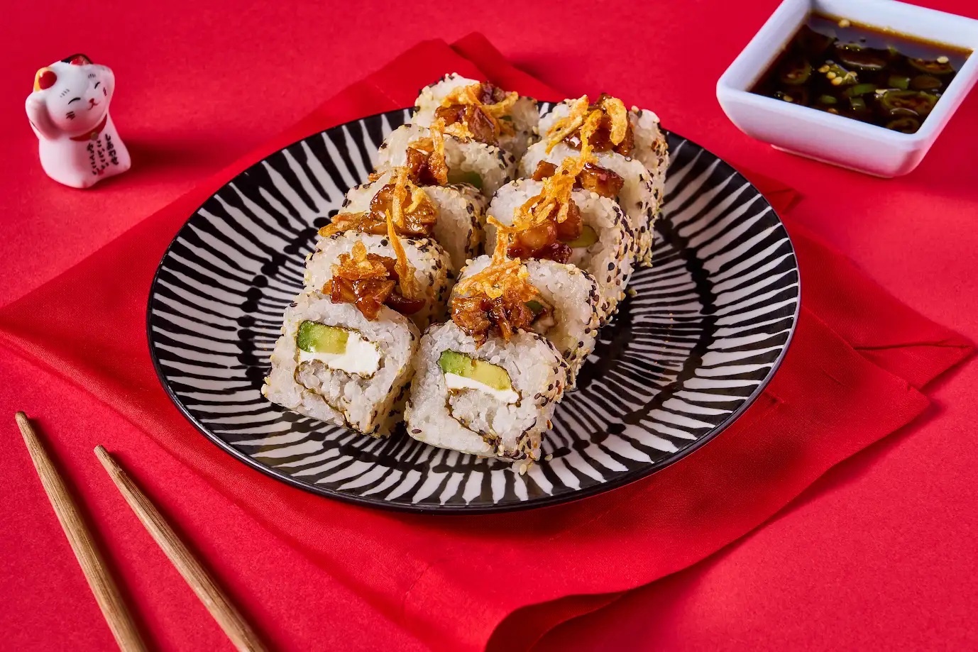 Rollo con zanahoria crujiente, surimi, queso crema y aguacate, con salsa BBQ y ajonjolí.