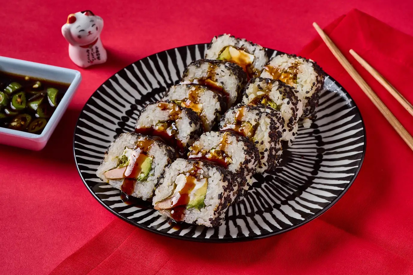 Rollo con atún sellado, chiles, aguacate y queso crema, con salsa BBQ y ajonjolí.