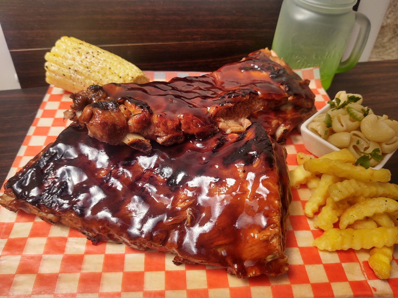 Jugosas y tiernas costillas bañadas en salsa BBQ 350 gr., acompañadas de papas a la francesa, agua frutal ó refresco y elote tierno.