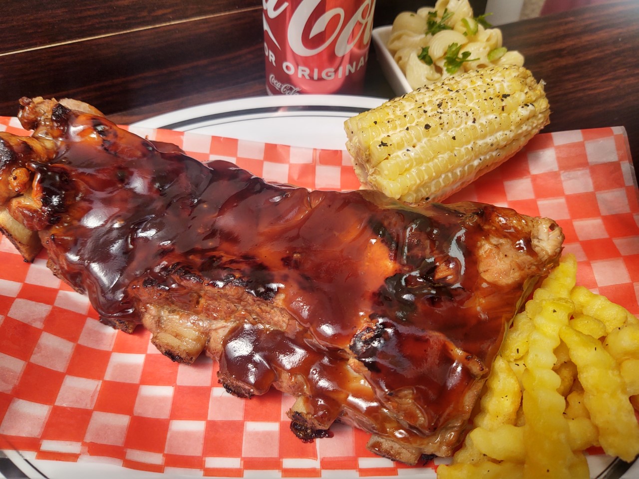 Deliciosas costillas a la bbq, acompañadas de elote, papas y coca 600 ml