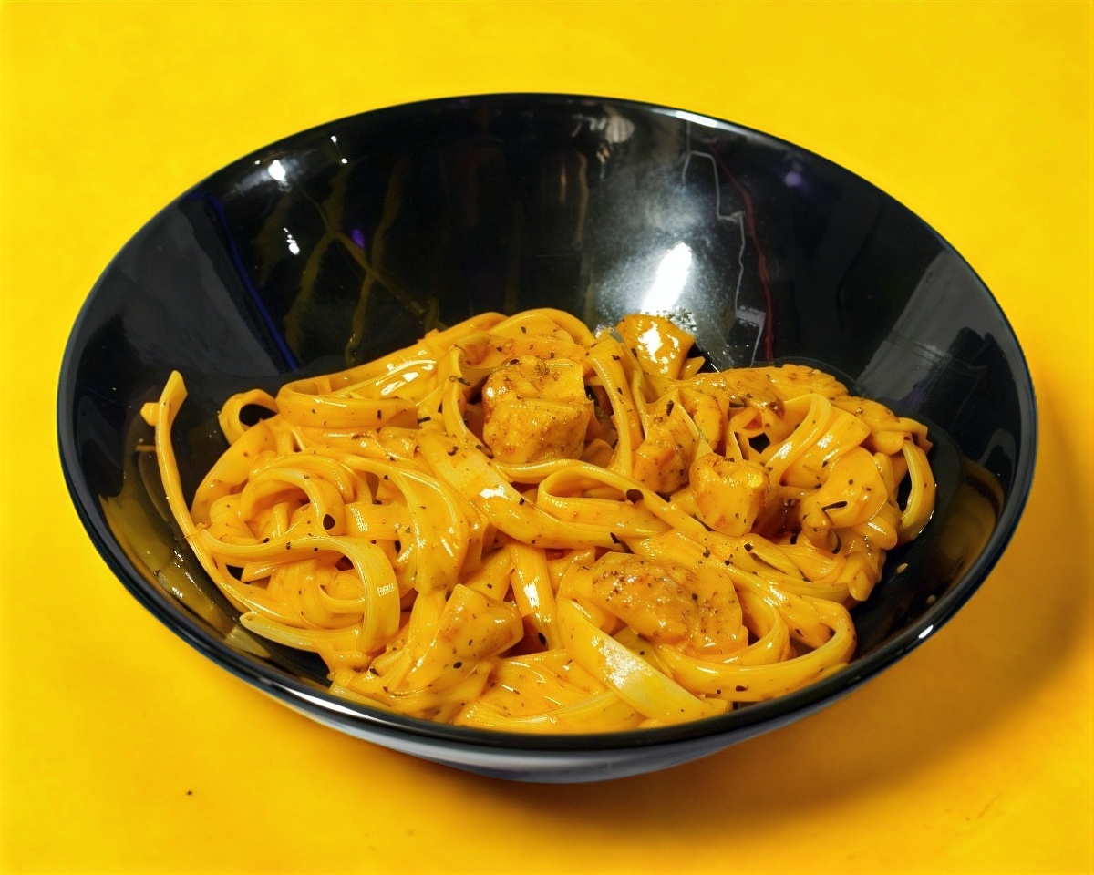 Pasta con deliciosos trocitos de pollo, picosita salsa macha y crema, con pimentón triturado.