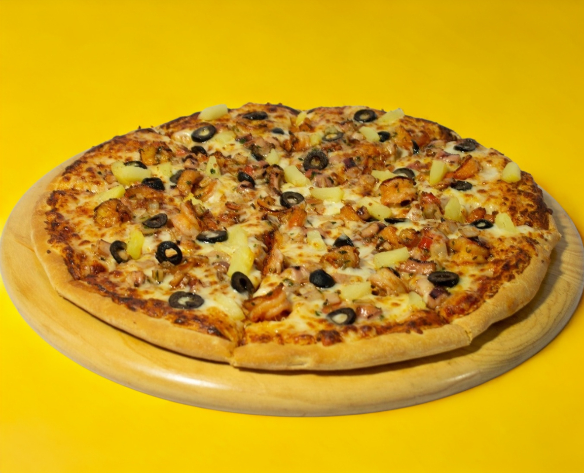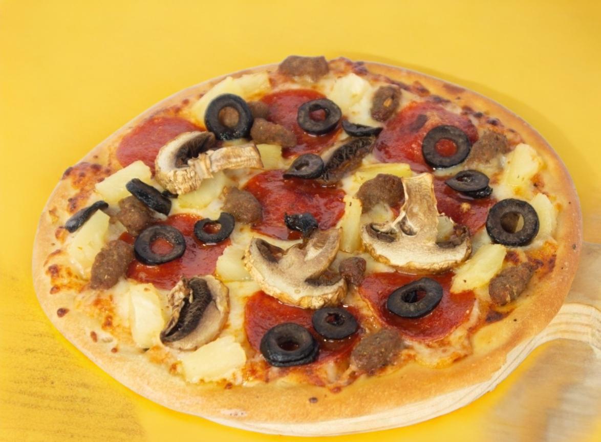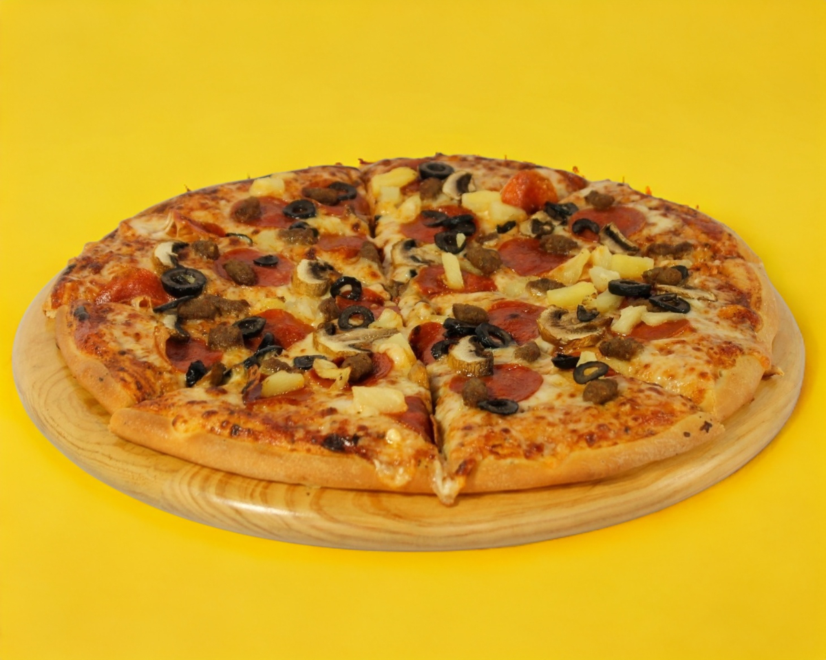 Salsa de tomate, mix de quesos, pepperoni, champiñones, salchicha italiana, piña, aceitunas negras.