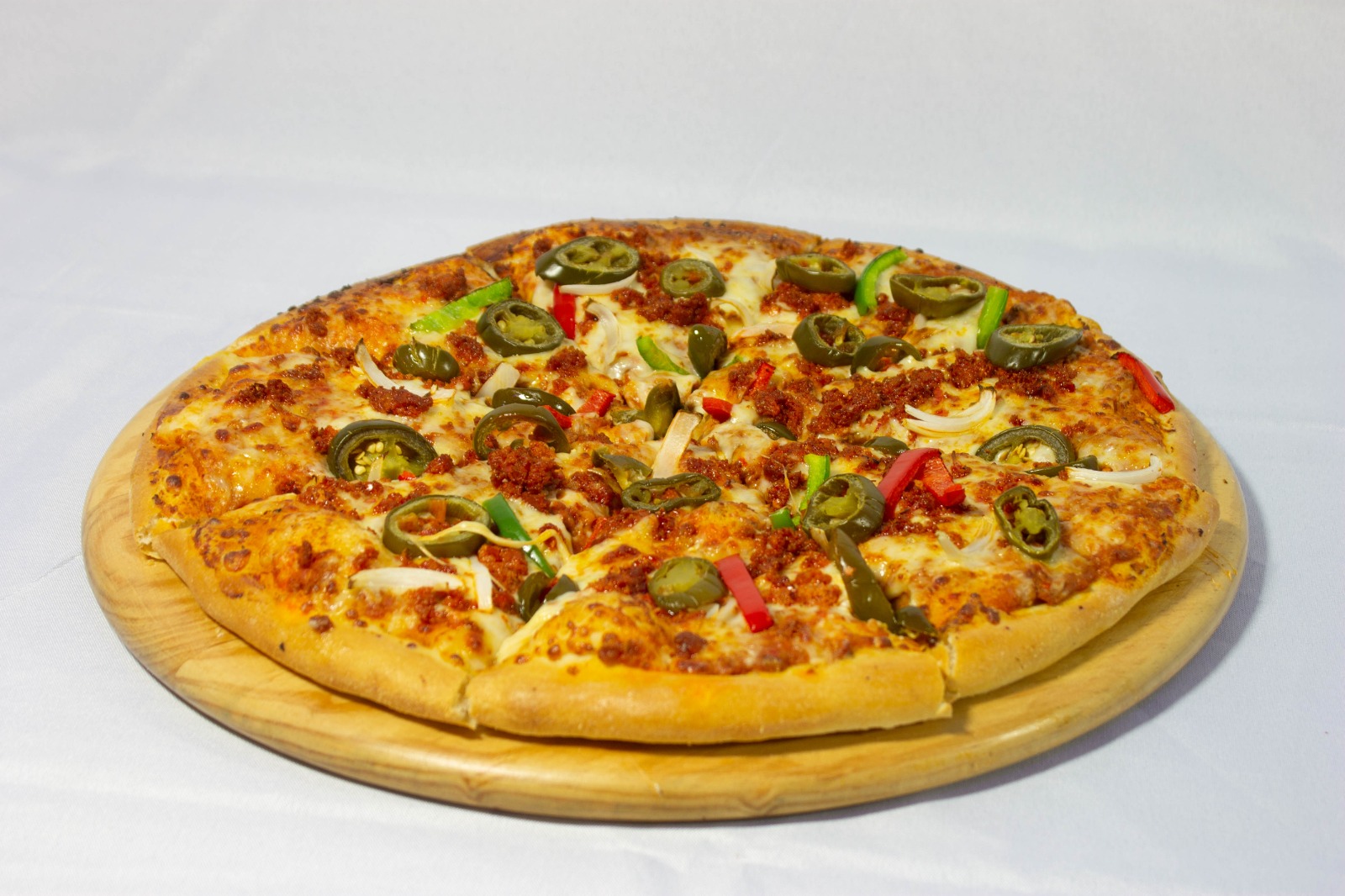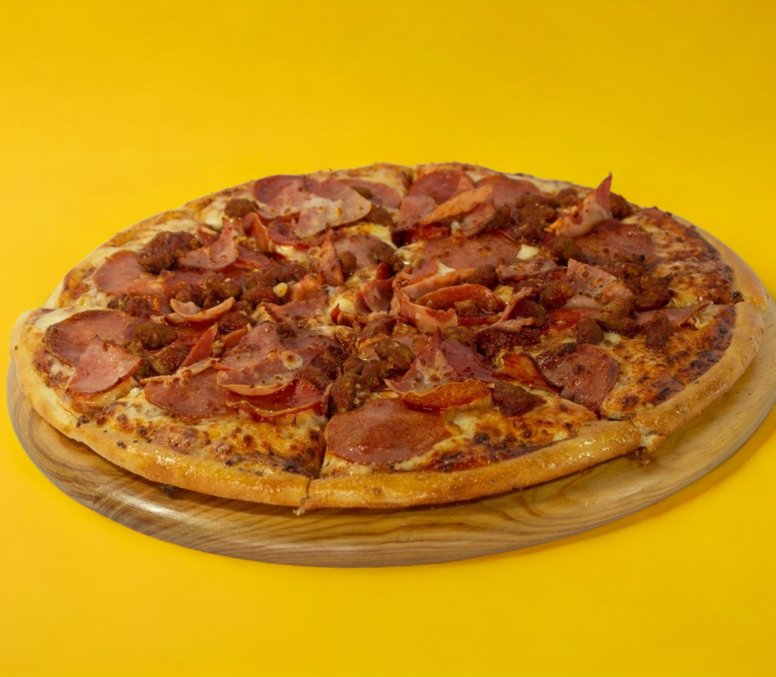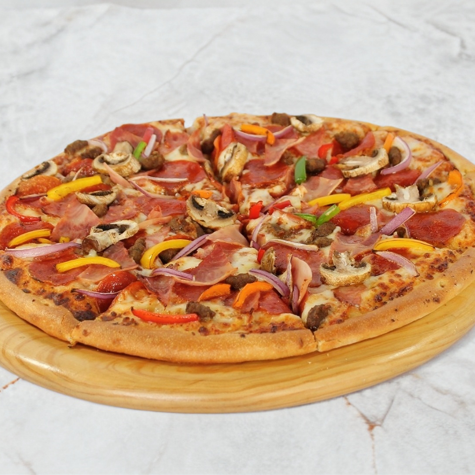 Salsa de tomate, mix de quesos, pepperoni, salchicha italiana, tocino, jamón, mix de pimientos, champiñones, cebolla.