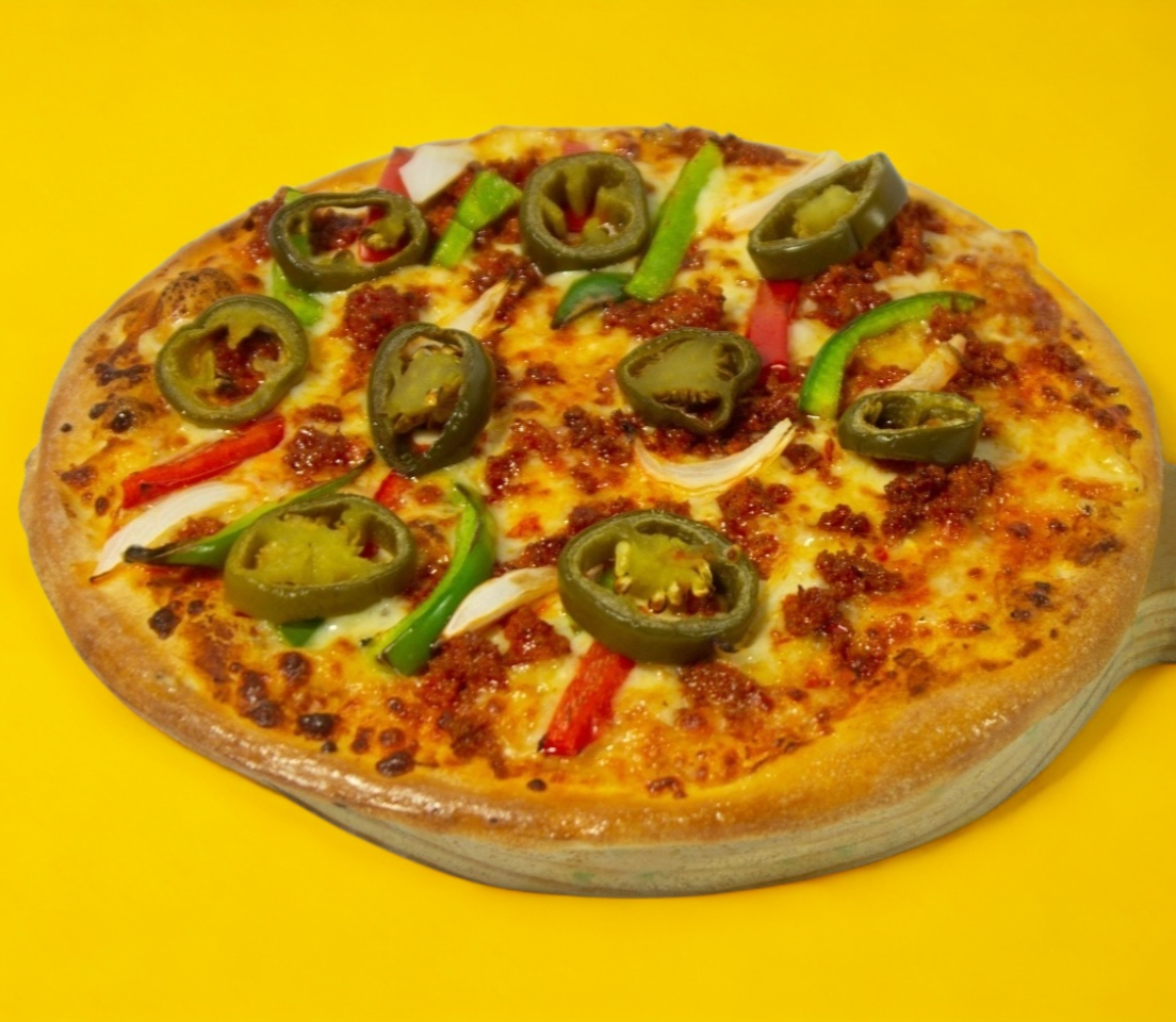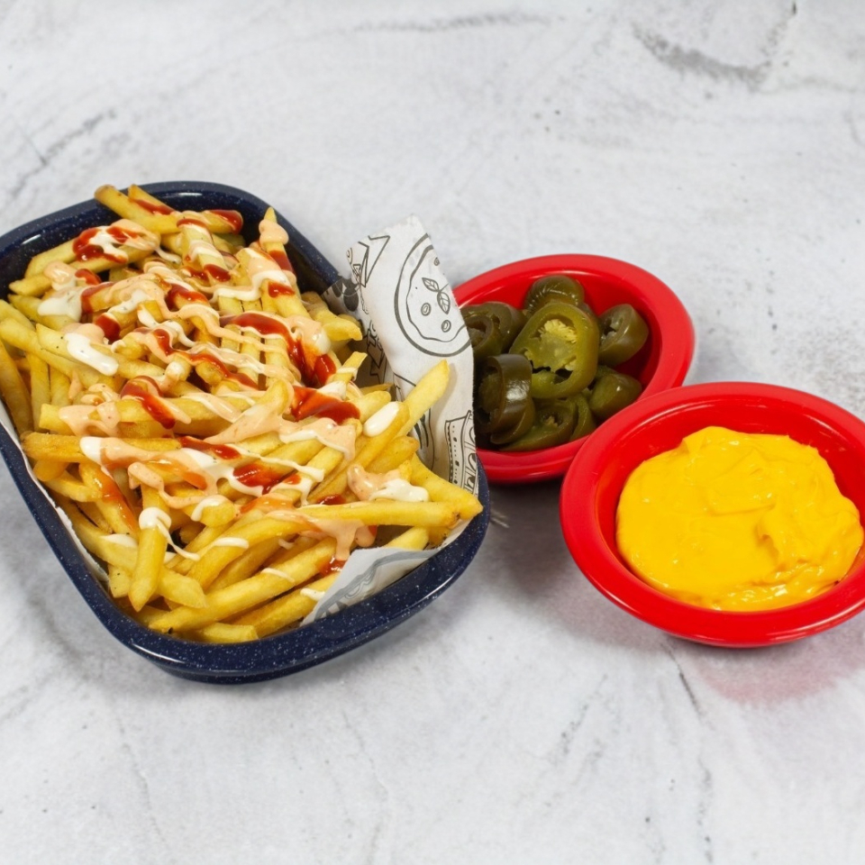 Frijoles refritos, mix de quesos, chorizo, jalapeños en rodajas, cebolla y pimientos.