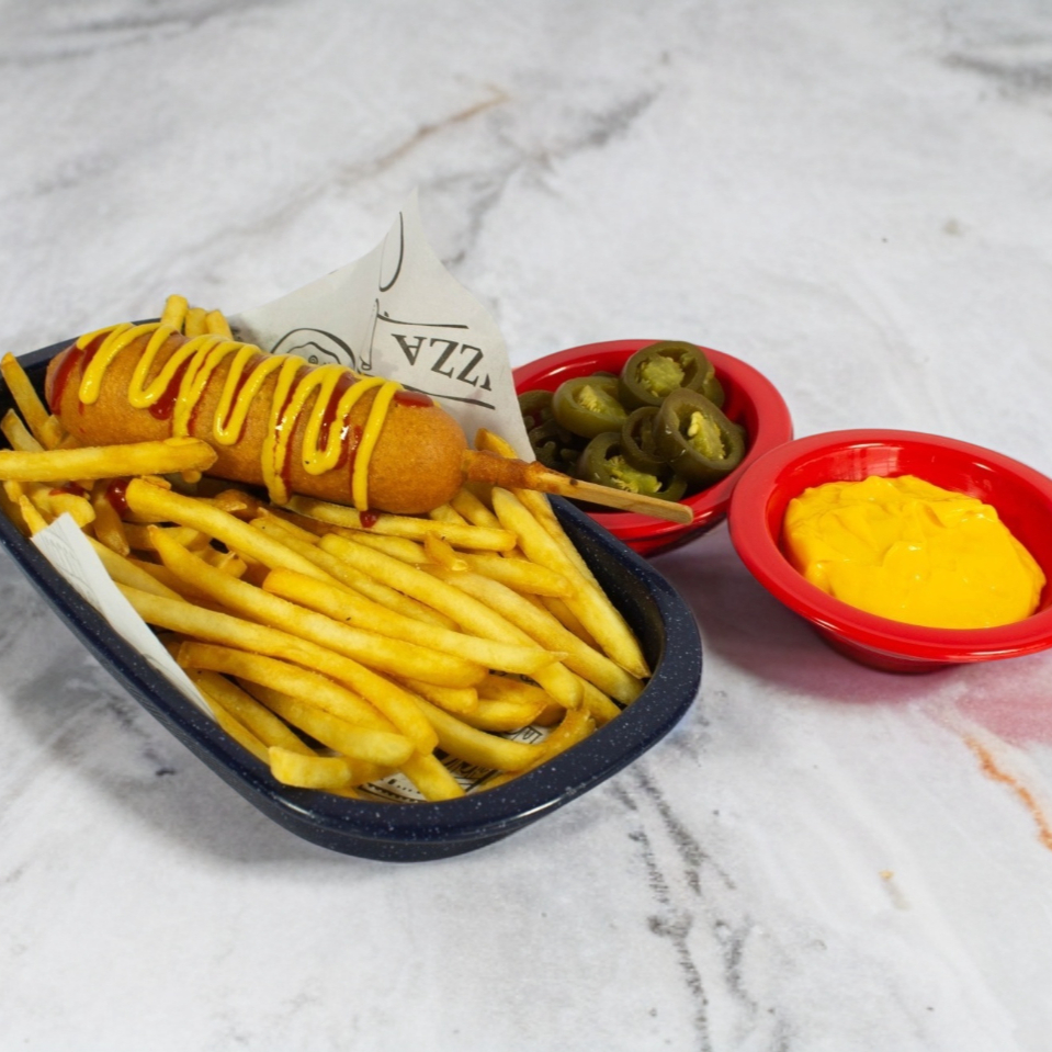 Banderilla de salchicha empanizada con un toque de miel crujiente acompañada de papas a la francesa.