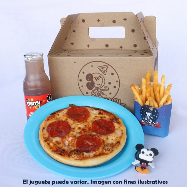 Incluye una Pizza mini, papas a la francesa, juguete de temporada y frutsi.