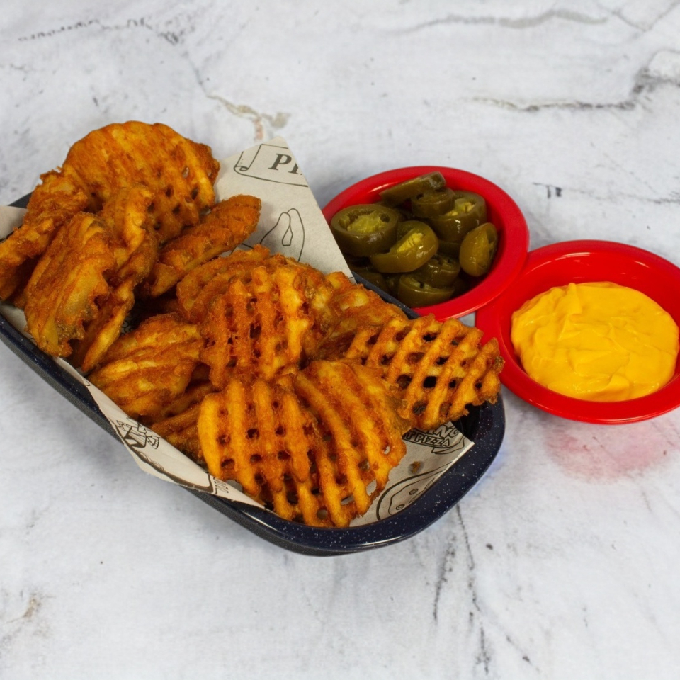 Papas rejilla bañadas con salsita de chipotle aderezo ranch y rodajitas de jalapeño. (350 grs)
