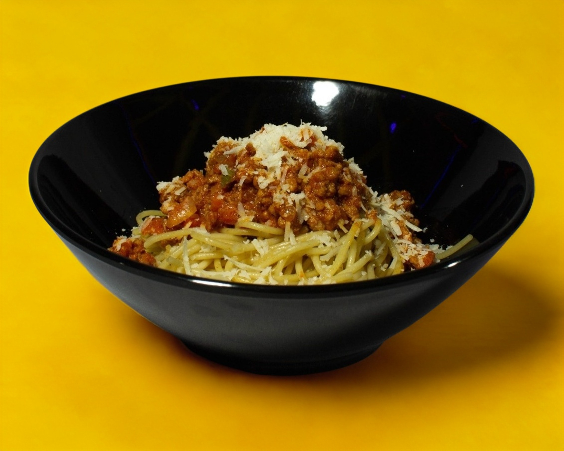 Pasta acompañada con la tradicional salsa italiana de tomate, zanahoria, apio, cebolla, tocino, jugosita carne comnor choice y parmesano.