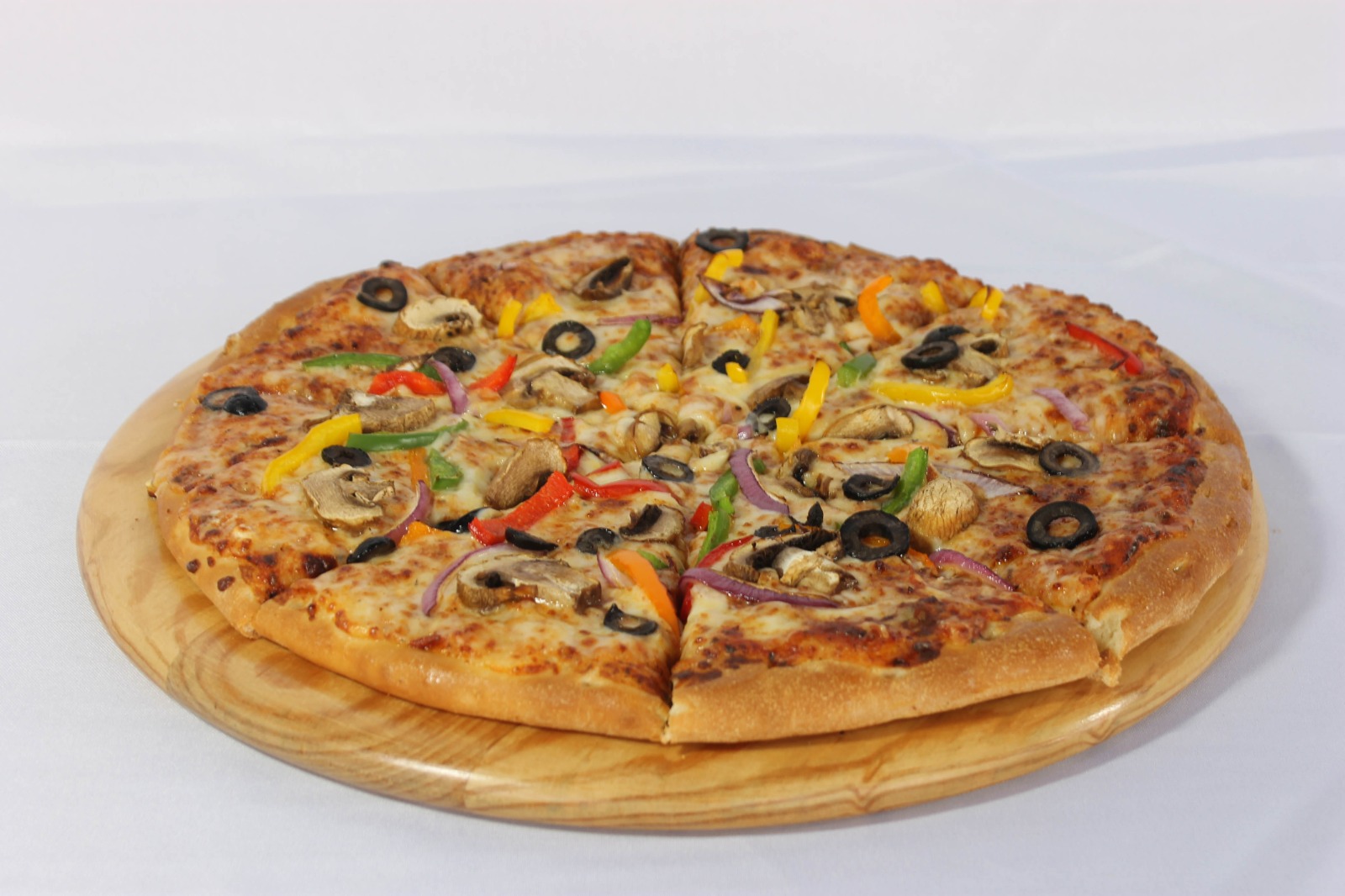Salsa de tomate, mix de quesos, mix de pimientos, aceitunas negras, champiñones, cebolla.