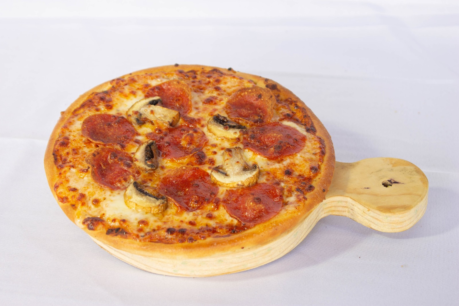 Salsa de tomate, mix de quesos, pepperoni y champiñones.